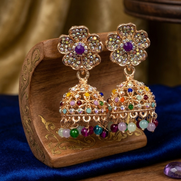 Golden Blossom Multi-Color Crystal Jhumka Earrings