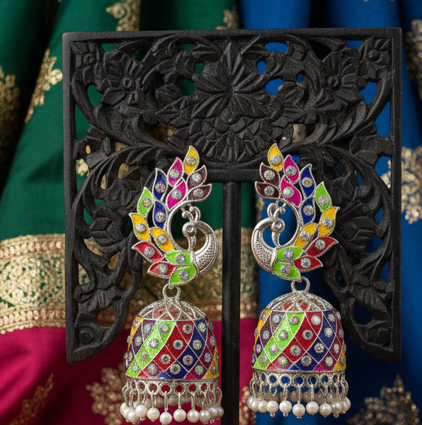 Rainbow Peacock Enamel Jhumka Earrings