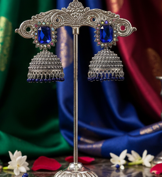 Oxidized Silver Royal Blue Stone Statement Jhumkas