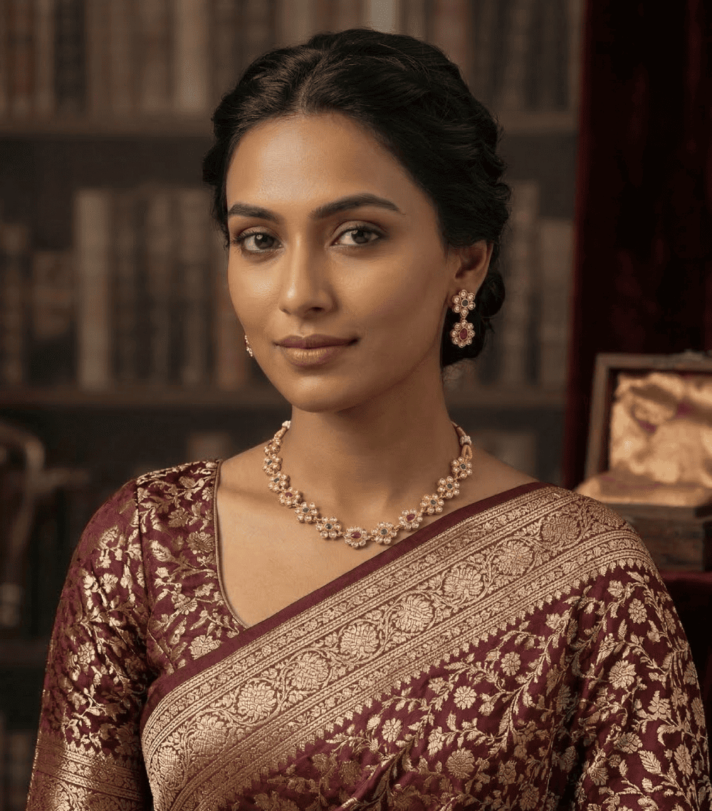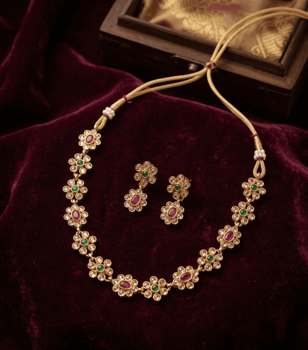Add timeless elegance to your jewellery collection with these beautiful antique gold floral drop earrings. Designed with intricate floral craftsmanship, these earrings feature vibrant red and green stones set in a rich gold finish. The delicate leaf details and hanging elements create graceful movement, making them perfect for weddings, festivals, and traditional occasions. Pair them with sarees, lehengas, or ethnic outfits to complete a stunning festive look.