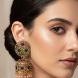 • Design: Oversized circular studs with traditional bell-shaped jhumka drops.