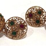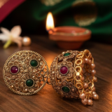 Be the first to review “Antique Gold Floral Jhumka Earrings with Ruby & Emerald Accents”
