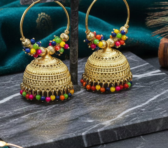 • Design: Traditional jhumka with a geometric mosaic pattern.