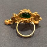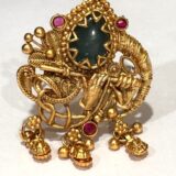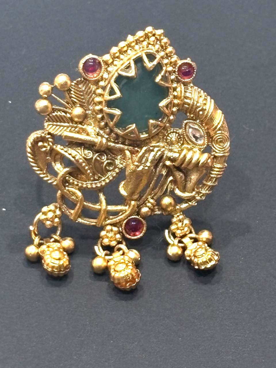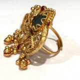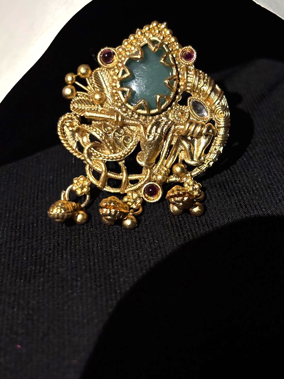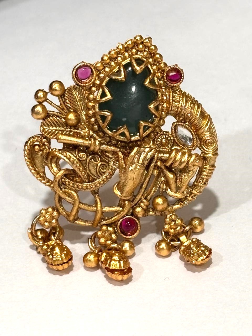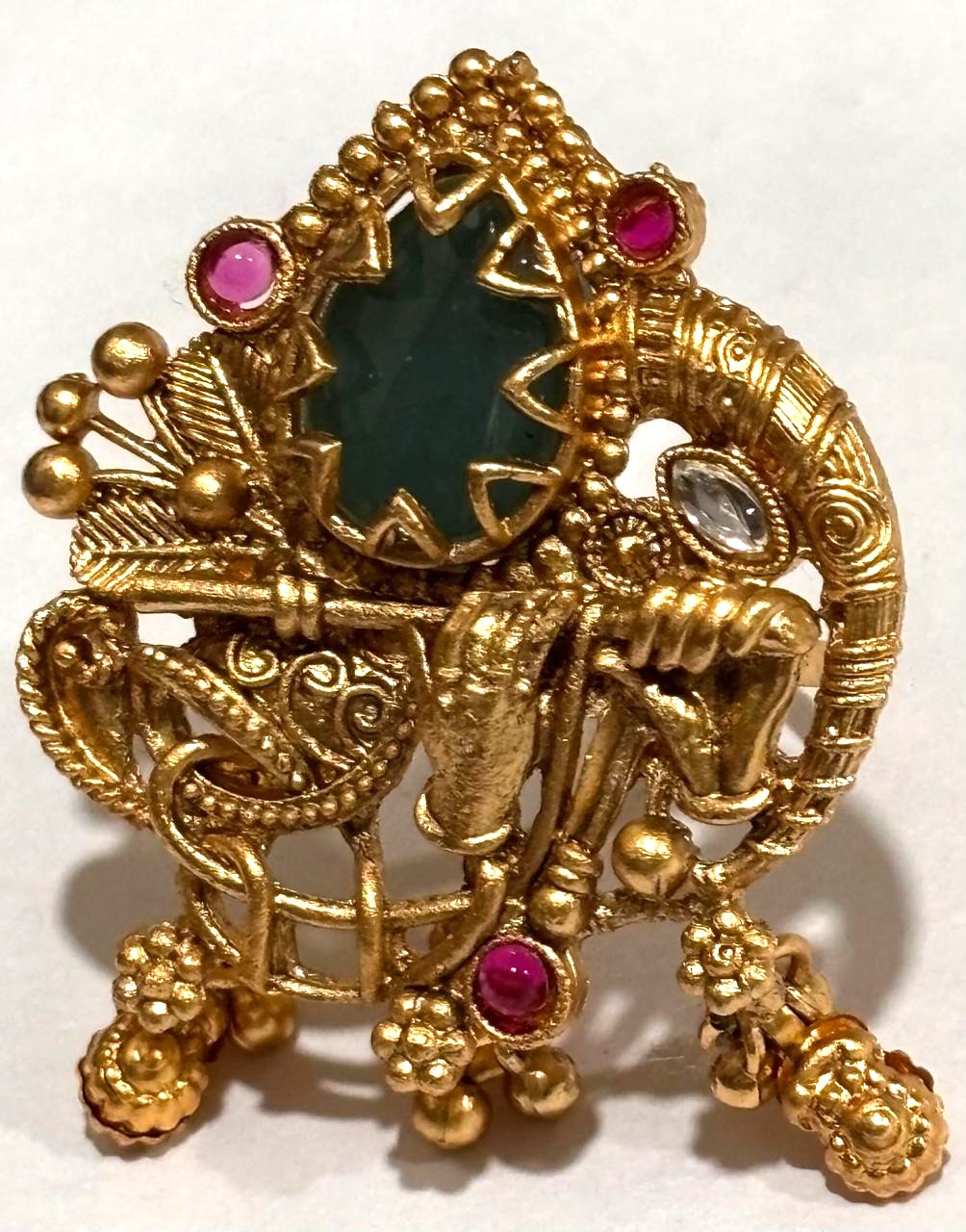• Celebrate traditional artistry with this beautifully designed antique gold-toned ring. The centerpiece features a detailed depiction of Lord Krishna playing the flute, accented with a vibrant green central stone and small ruby-red stones. The ring is enhanced with delicate hanging gold bells that create a soft jangling sound.