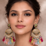Infuse your look with a burst of color and bohemian charm with these stunning antique gold-toned chandelier earrings. The design features a colorful, circular stud encrusted with red, green, and yellow crystals, leading down to a magnificent filigree crescent frame.