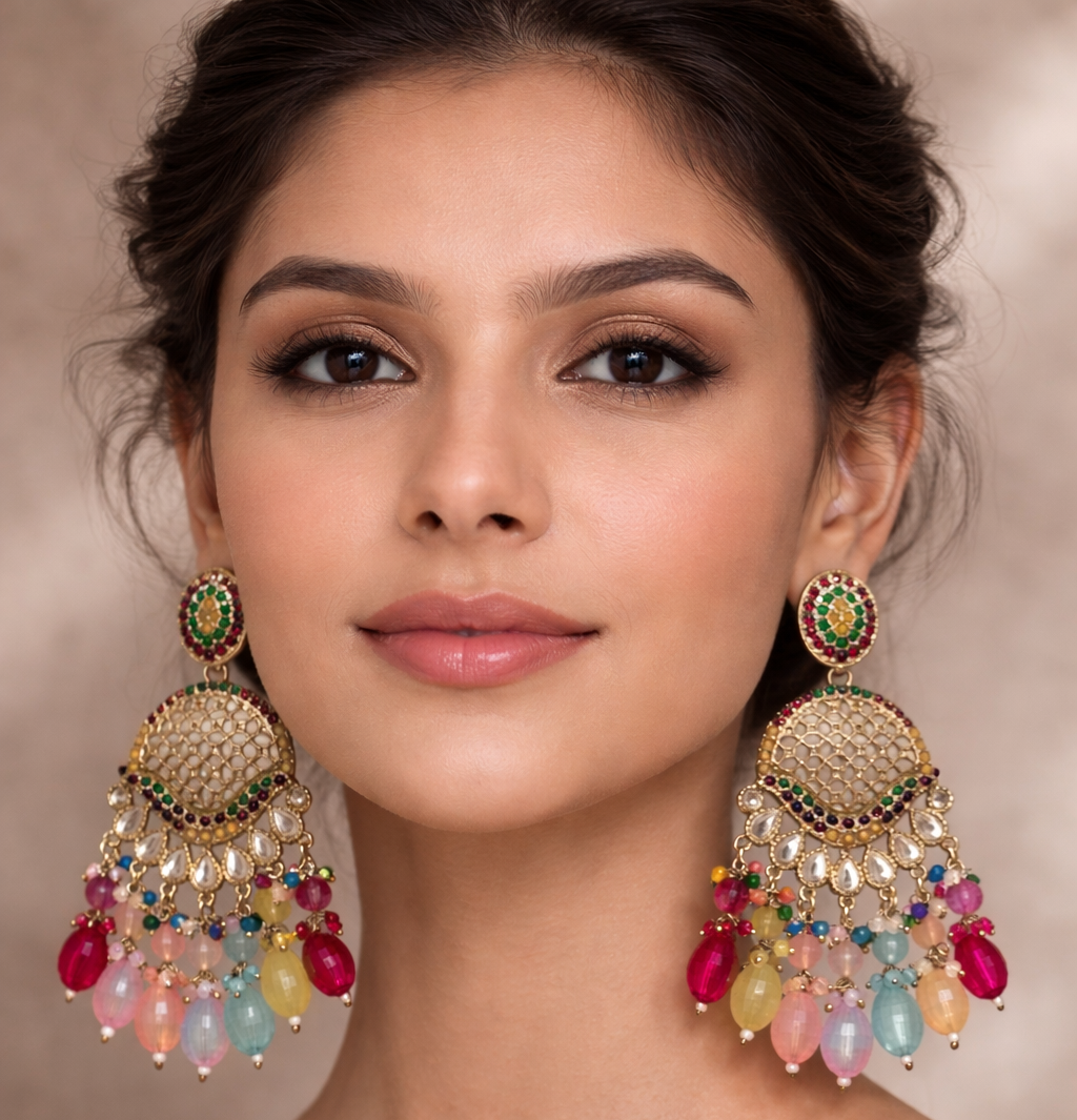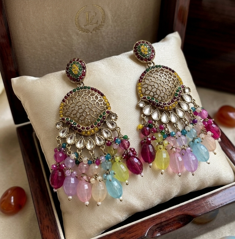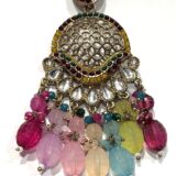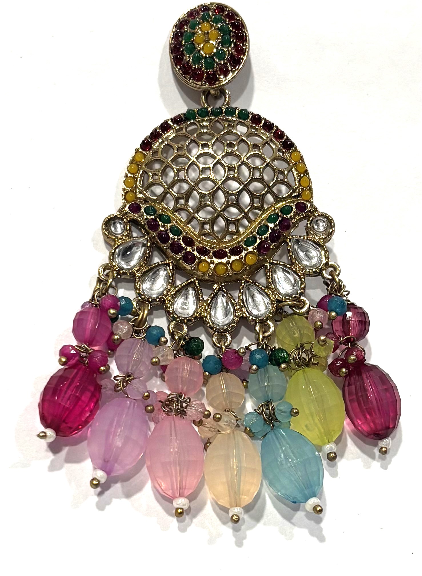 • Design: Multi-colored chandelier style with a filigree crescent and beaded fringe.