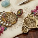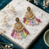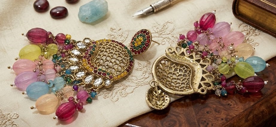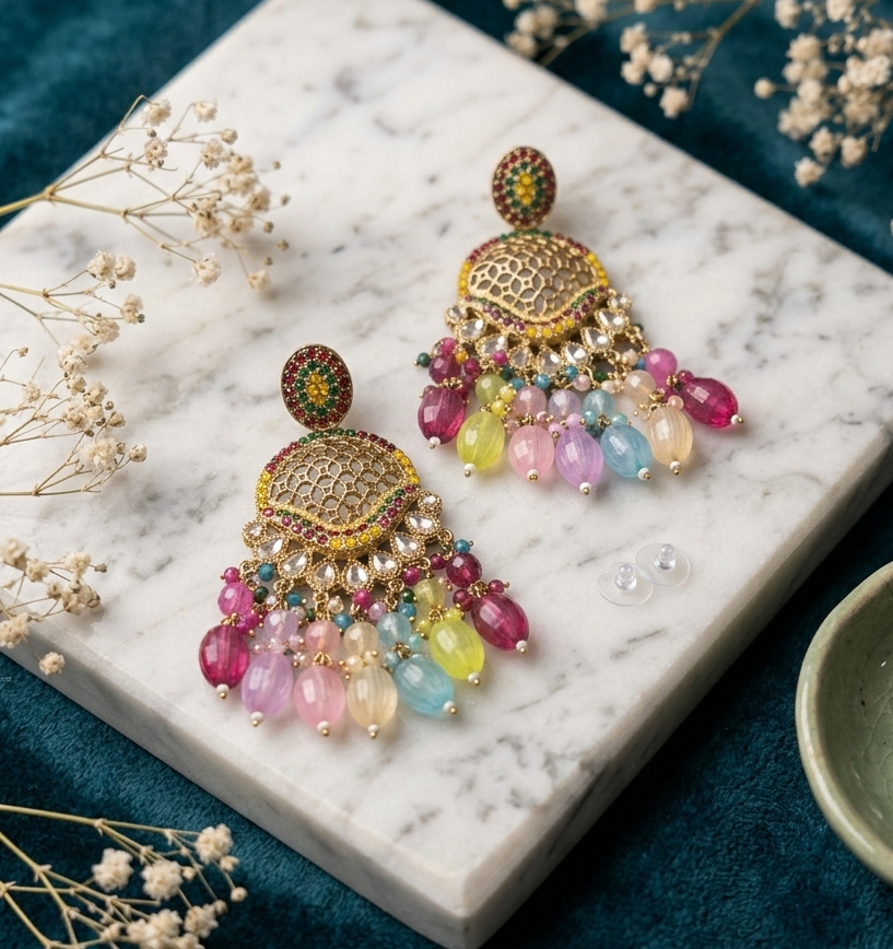 • Embellishments: Faceted colorful beads, clear teardrop crystals, and a mosaic of red, yellow, and green stud stones.