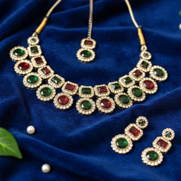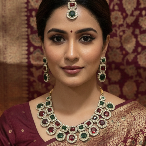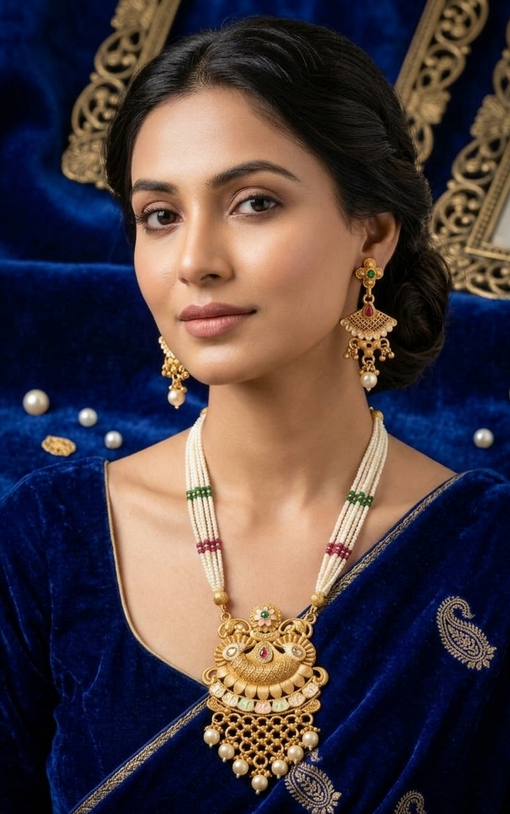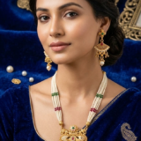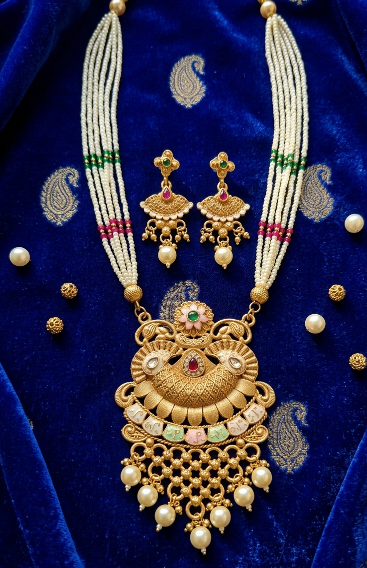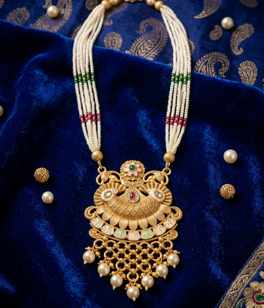 The long necklace is composed of multiple strands of seed pearls interspersed with stations of vibrant green and ruby-red beads, providing a beautiful textural contrast and a traditional ‘Sathlada’ (seven-strand) inspired feel. It features a beautifully designed side-pendant link for asymmetry and traditional character.
