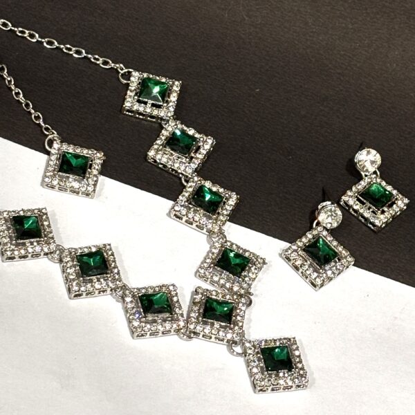 Complementing the necklace are a pair of matching dangling earrings. Each earring has a top green stone post and a fan-shaped kundan and enamel drop with its own cluster of matching pearl beads, perfectly echoing the pendant’s design. This set is a perfect statement piece for weddings, festivals, and special traditional occasions, designed to be treasured for generations. The set includes one necklace and one pair of matching earrings.
