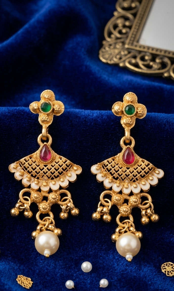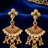 Adorn yourself with the timeless elegance of this exquisite Antique Temple Jewelry Set. Crafted in an authentic antique gold finish, this set captures the essence of traditional temple art with its intricate, hand-carved pendant featuring a central motif adorned with kundan-style settings, a deep red ruby doublet, a central green emerald stone, and a cluster of delicate pearl drops.
