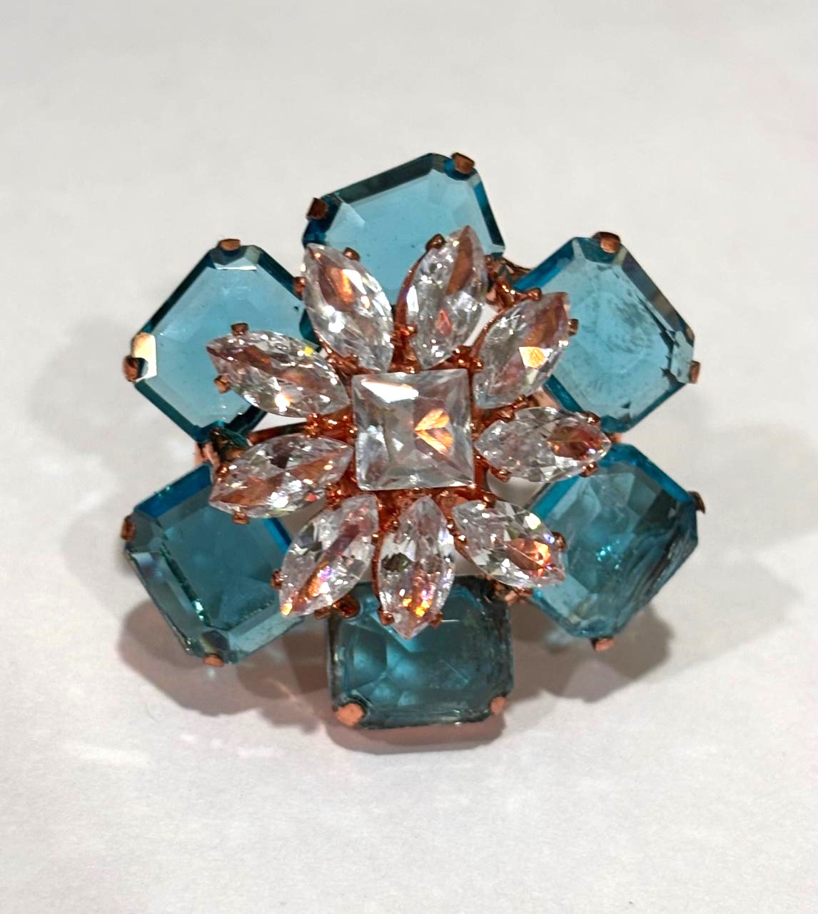 Make a vibrant statement with this eye-catching cocktail ring, designed in the shape of a blooming flower. The ring features large, emerald-cut blue crystals forming the petals, contrasted by a sparkling center of marquise-cut and square-cut clear crystals.