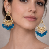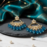 The highlight of these earrings is the luxurious cascade of deep blue crystal drops that add richness, shine, and graceful movement. Designed to complement bridal, festive, and party outfits, these earrings perfectly blend traditional Indian craftsmanship with modern elegance.