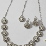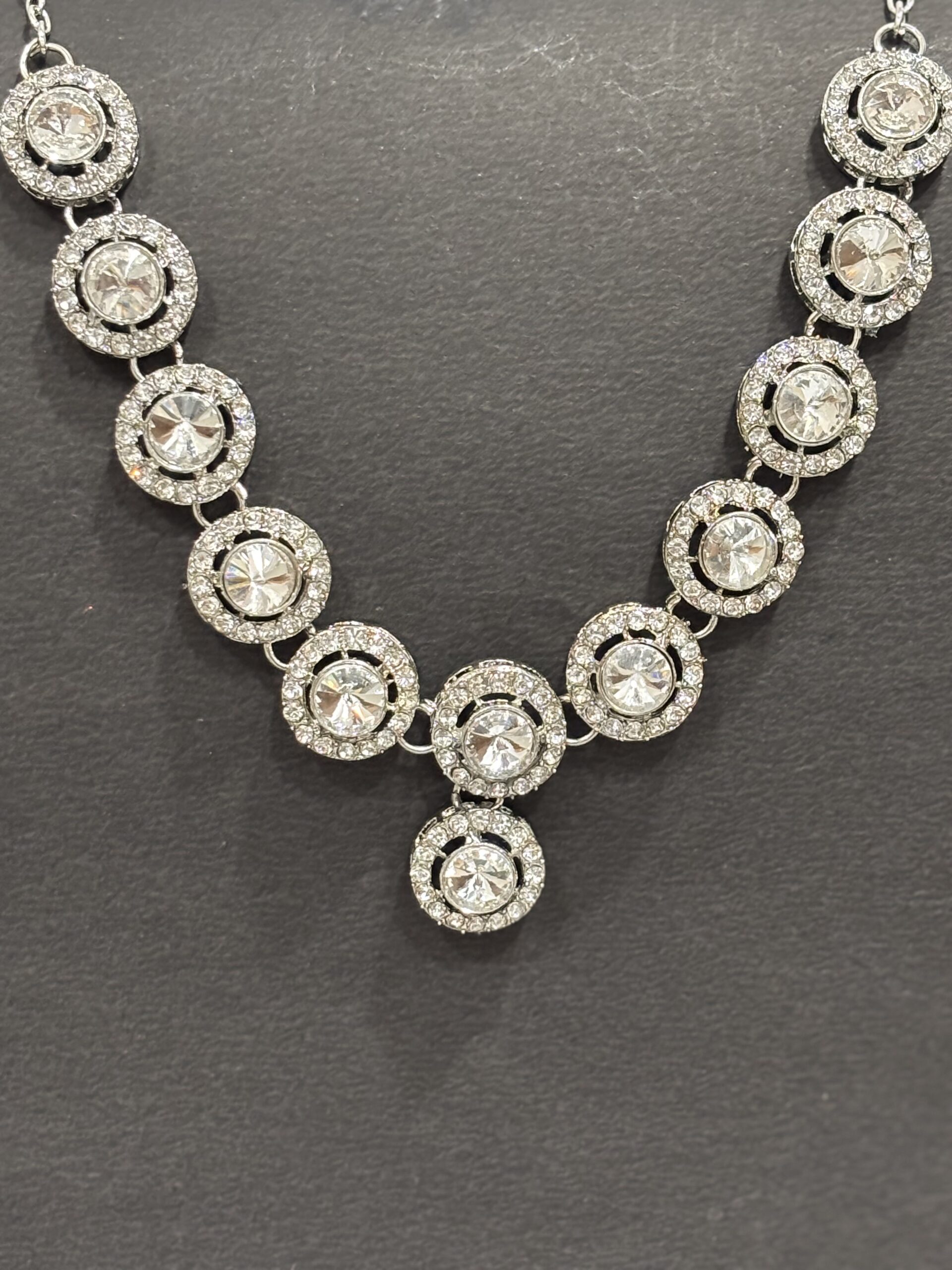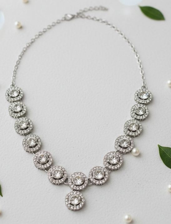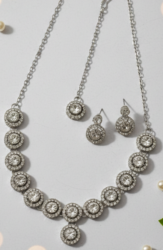 Luminous Elegance in Every Facet Step into the spotlight with this stunning three-piece jewellery set, a celebration of light and traditional artistry. This set features a sequence of brilliant-cut circular stones, each meticulously framed by a shimmering halo of smaller accent gems, creating a radiant glow that mimics the vintage charm of fine Polki diamonds.