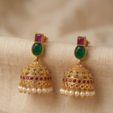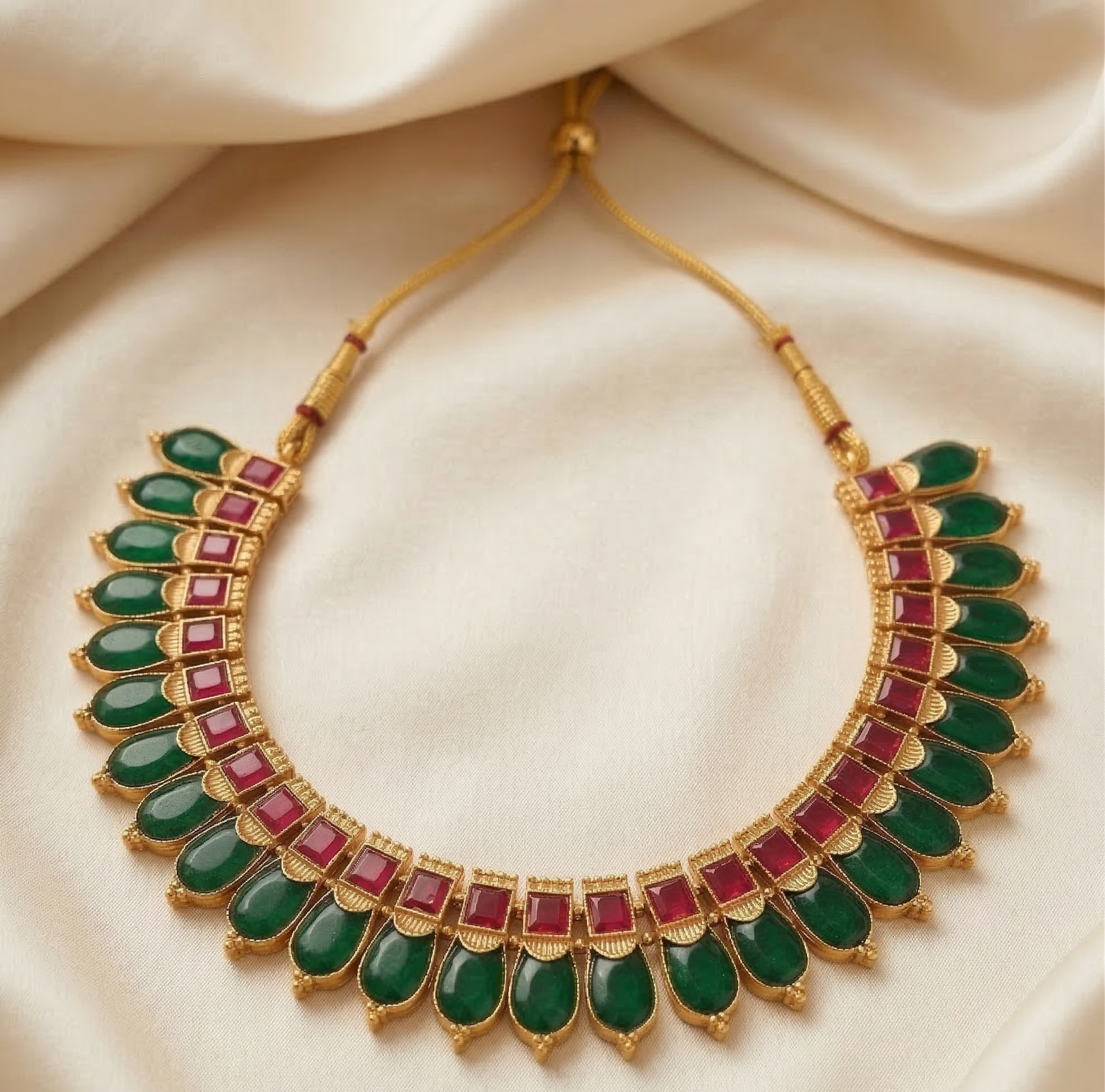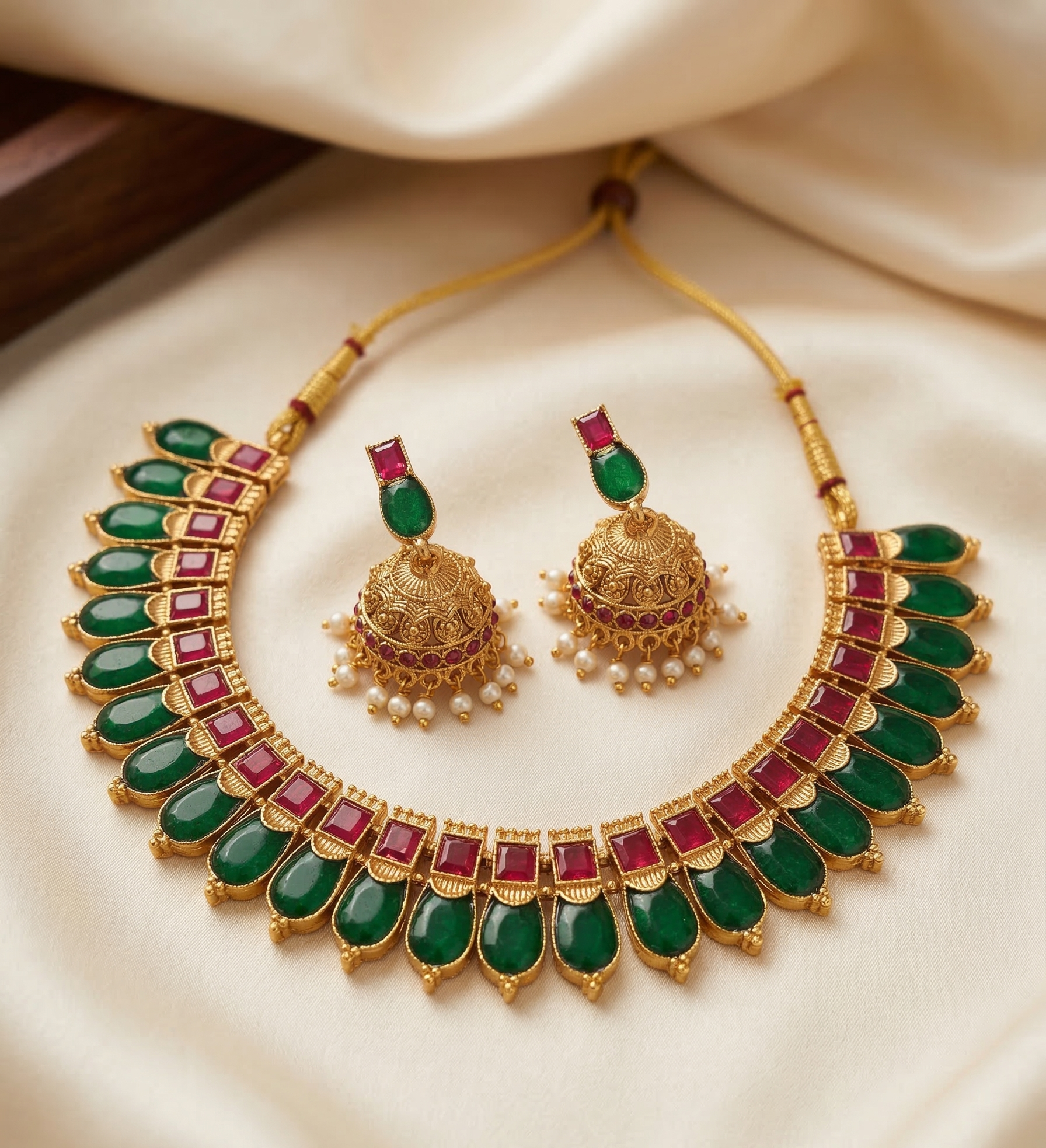 Add a touch of timeless elegance to your jewellery collection with this exquisite traditional set. This curated piece features a magnificent gold-plated choker necklace and matching Jhumka earrings, adorned with brilliant square-cut synthetic rubies and teardrop emerald stones. The necklace boasts a beautiful, repeating pattern, while the earrings are intricately detailed with small pearl drops for a graceful finishing touch. The adjustable cord ensures a comfortable fit, making this set ideal for special occasions, weddings, and festive celebrations. Perfect for channeling a classic yet sophisticated look, this is a must-have for the modern woman who appreciates traditional craftsmanship.