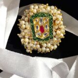 Make a bold statement with this shield-inspired traditional ring. The central feature is a vibrant green enamelled shield set with Kundan stones and a striking ruby red center stone. The entire motif is surrounded by a thick, luxurious cluster of small white moti (pearls), creating a voluminous and royal look. Design: Shield motif with Enamel and Moti cluster Stones: Kundan, Ruby, White Moti (Pearls) Finish: Gold-toned Best for: Bridal wear, festive celebrations, and traditional attire.