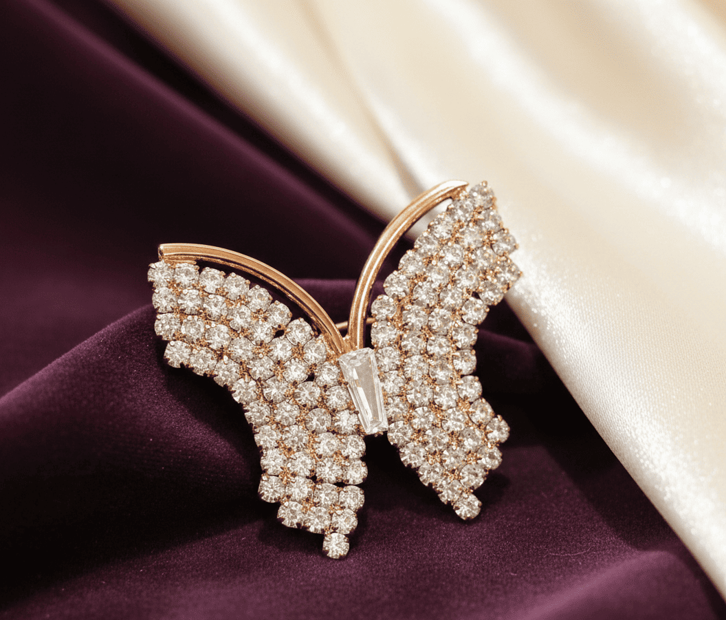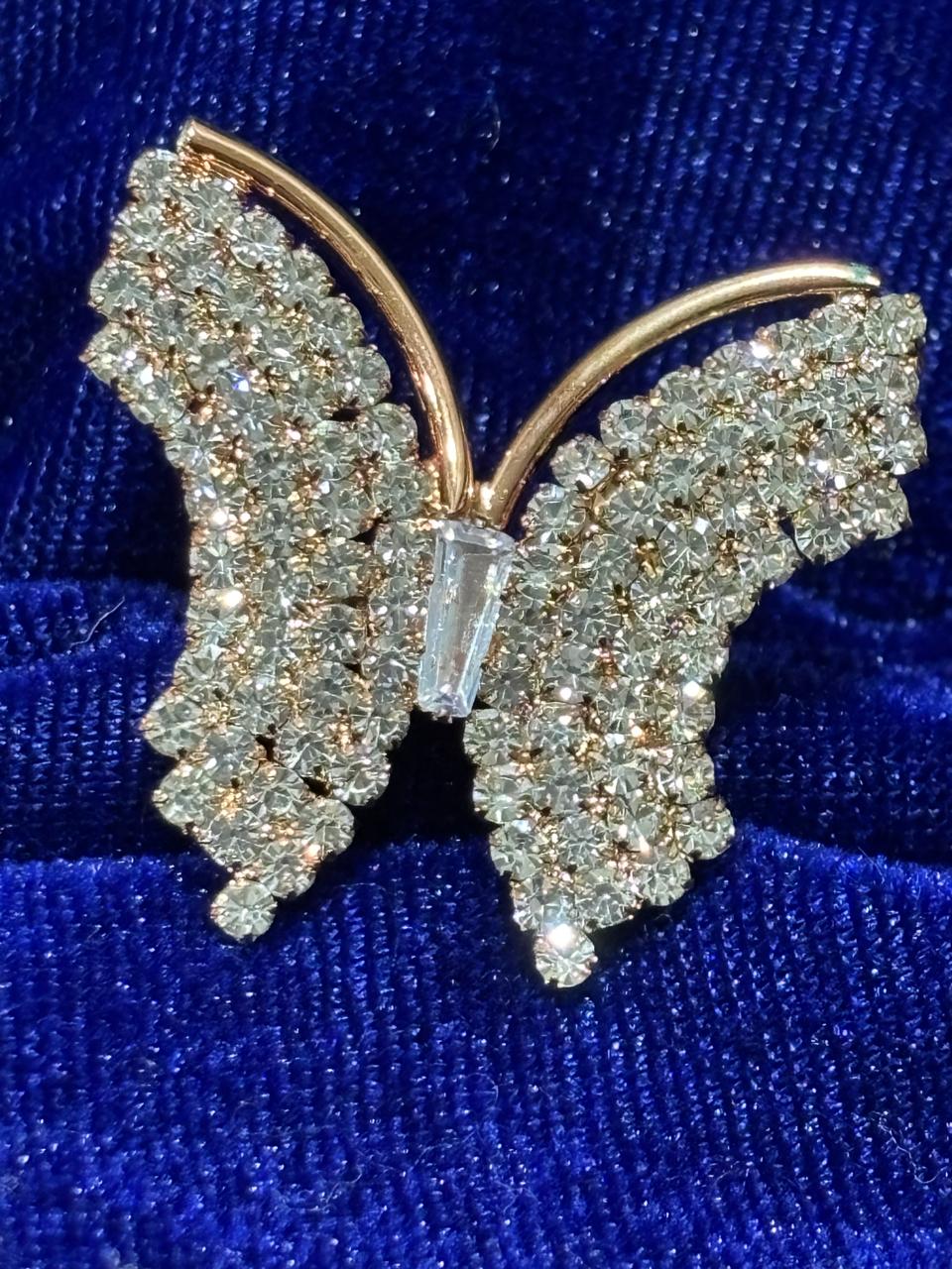 Designed to be the center of attention, the butterfly centerpiece is accented with a single, elongated baguette-cut crystal for added sophistication.