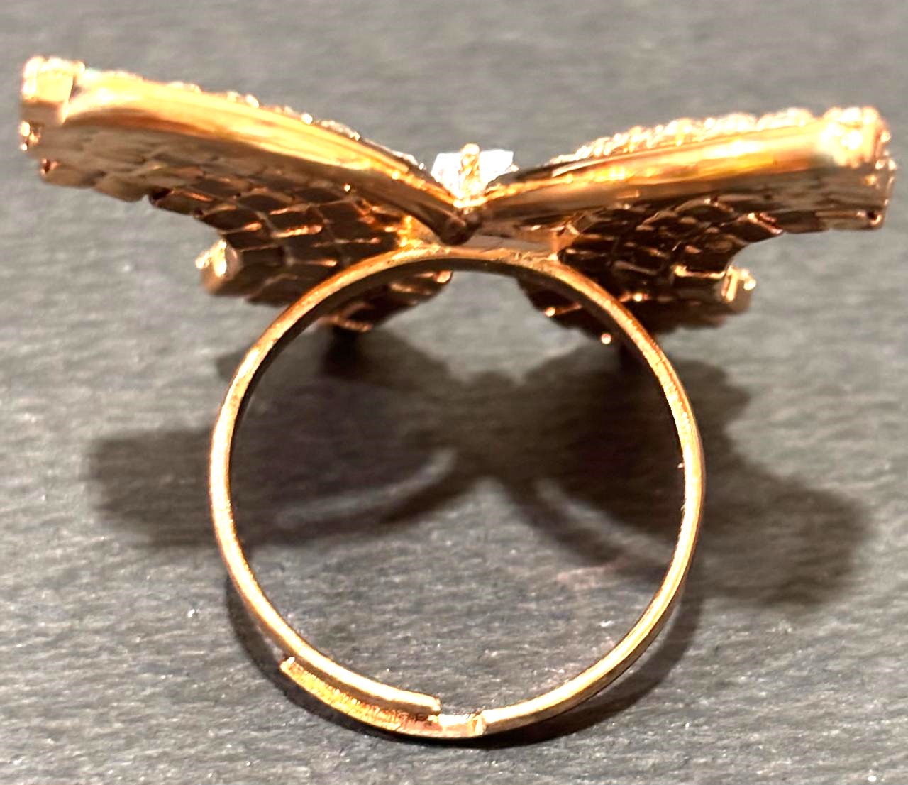 Make a bold statement with this exquisite butterfly ring. This stunning piece features a delicate rose gold-toned frame intricately paved with dozens of brilliant, clear crystals that catch the light from every angle.