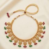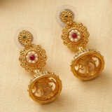Bring a touch of heritage to your modern wardrobe with our Divine Floral Drop set. This set stands out with its intricate gold filigree work and a stunning alternating pattern of red and green bead clusters that provide a rhythmic, graceful movement. The matte gold finish lends an air of understated luxury, making it a versatile accessory for both grand celebrations and intimate family gatherings.