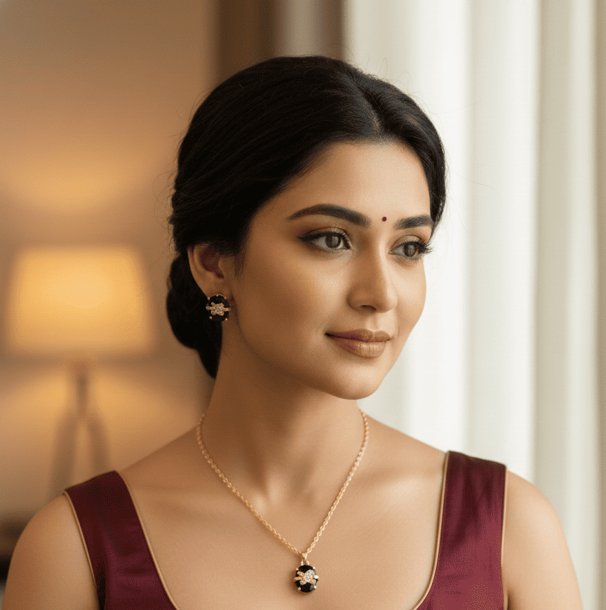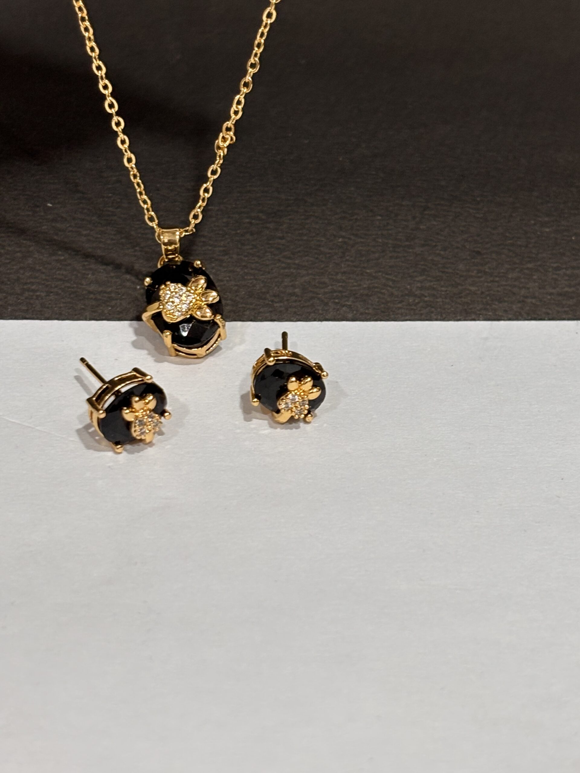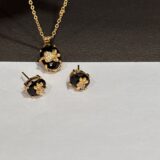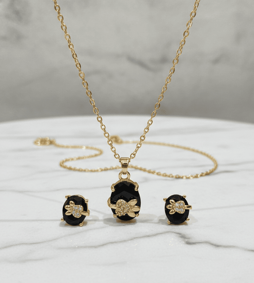 The set includes a matching pendant necklace and a pair of stud earrings, making it a perfect choice for daily wear, office wear, and special occasions. The sparkling stone accents add a subtle shine, while the classic black stone makes it easy to match with any outfit.