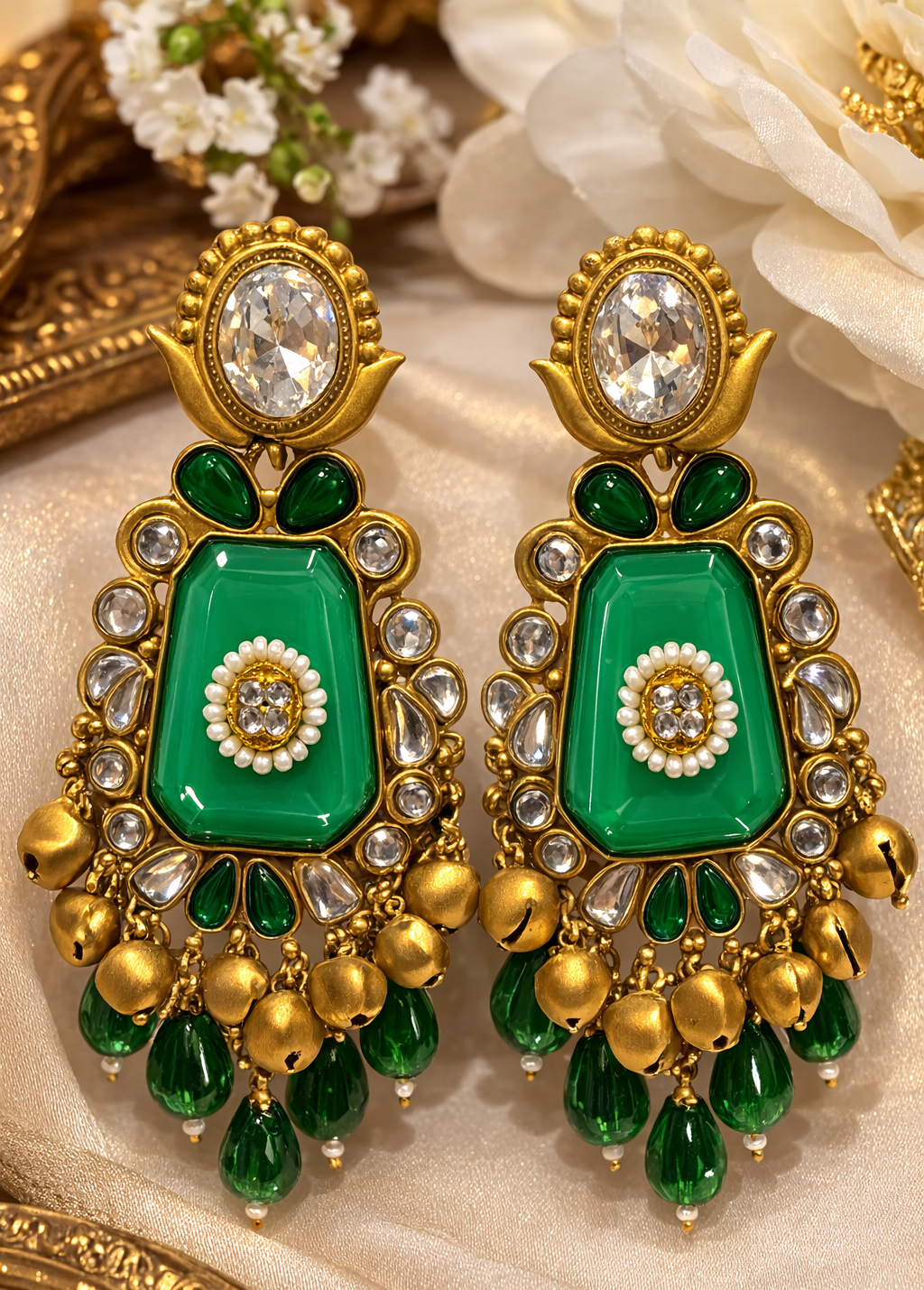 Central Grandeur: The centerpiece of each earring is a striking, large, emerald-green trapezoidal Kundan-style stone with a brilliant, highly-polished finish that commands attention.