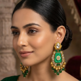 Intricate Details: At the center of the green stone lies a delicate circular motif featuring clear, brilliant Kundan crystals encircled by tiny, lustrous pearl beads.