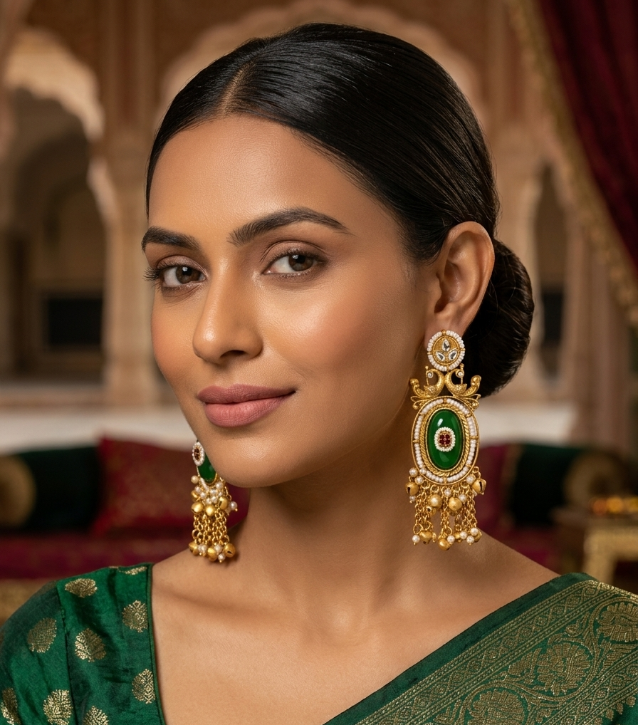 • Intricate Top: The top of each earring is intricately designed with fine Kundan stones and elegant filigree work, featuring a cluster of clear and green Kundan stones.