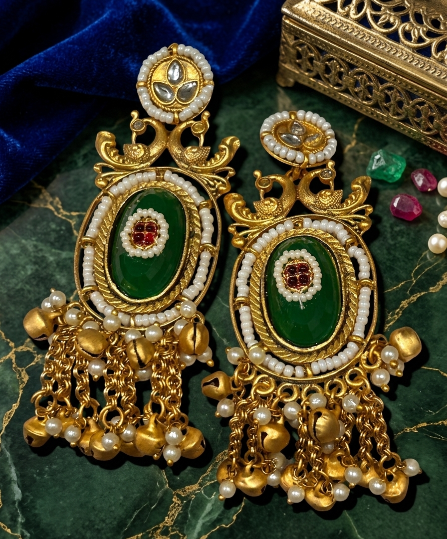 • Central Feature: Each earring boasts a stunning oval emerald-green Kundan stone, enveloped by multiple rows of delicate pearl seed beads.