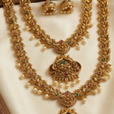 • Design: A sophisticated dual-necklace set featuring a shorter collar-style necklace and a matching longer Haaram. Both pieces boast intricate floral and peacock-inspired filigree work.