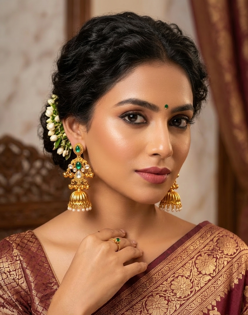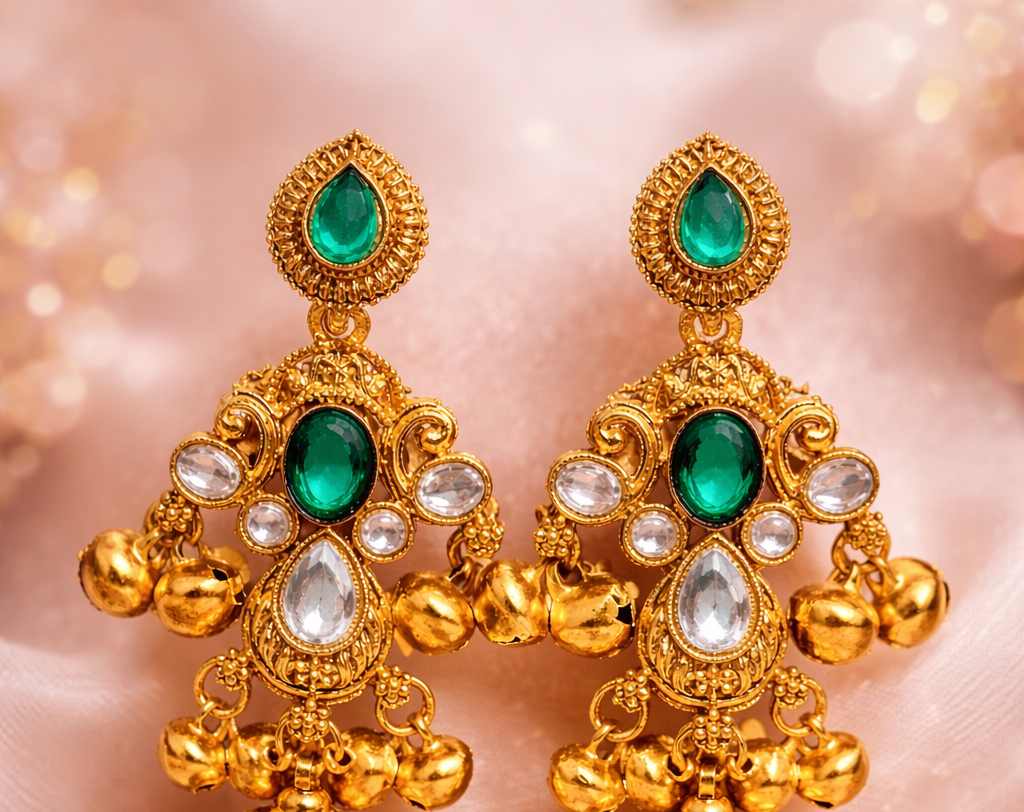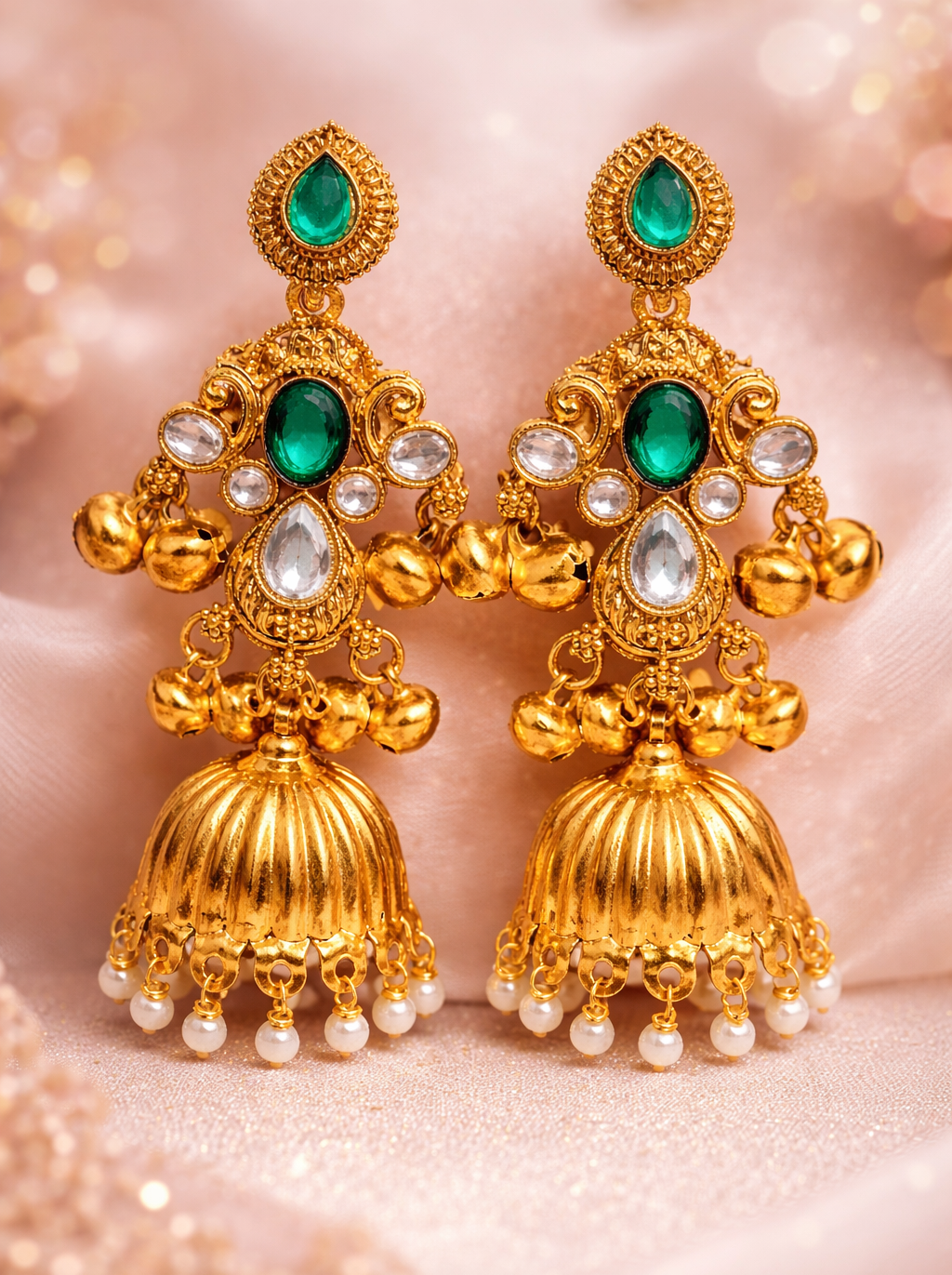 Adorn yourself with the timeless elegance of these exquisite Emerald and Pearl Jhumka Earrings. Crafted with unparalleled artistry, these earrings are a masterpiece of traditional Indian jewellery design, perfect for weddings, festivals, and special occasions.