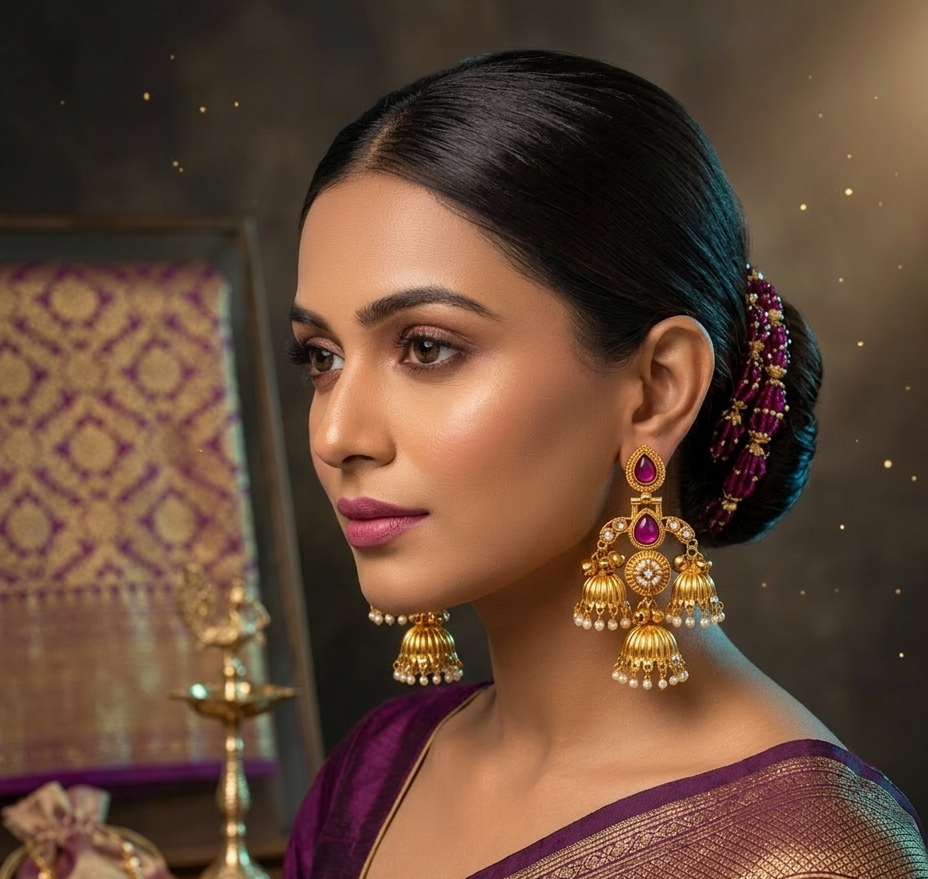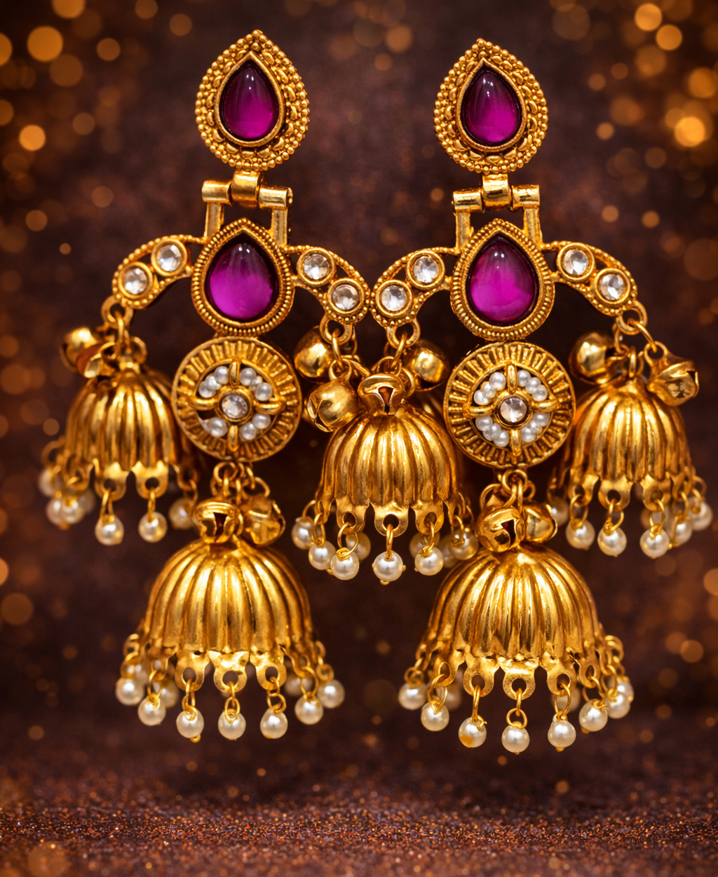 Adorn yourself with the timeless elegance of these exquisite Jhumka earrings. These statement pieces feature a breathtaking fusion of traditional Indian craftsmanship and contemporary design, making them a must-have for any jewelry collection.