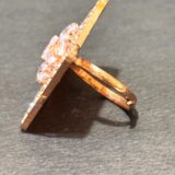 This bold statement ring features a large, diamond-shaped cushion design. The outer edge is intricately paved with small, shimmering clear crystals, framing a central cluster of larger oval-cut and emerald-cut stones. Set in a rose gold tone, this ring offers a modern, geometric aesthetic.