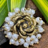 Exude timeless grace with this exquisitely designed statement ring. The centerpiece features a beautifully textured golden rose in an antique finish, capturing the delicate details of blooming petals. Encircling the floral motif is a lush, voluminous cluster of shimmering white pearls (moti), each individually wired to create a rich, tactile border.