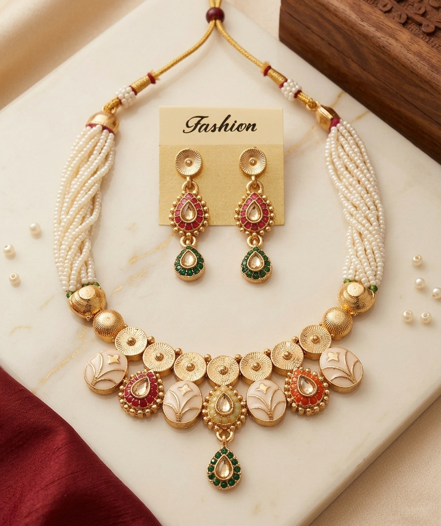 Be the first to review “Handcrafted Kundan-Style Pearl Necklace & Earring Set with Multi-Color Enamel”