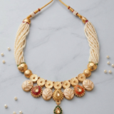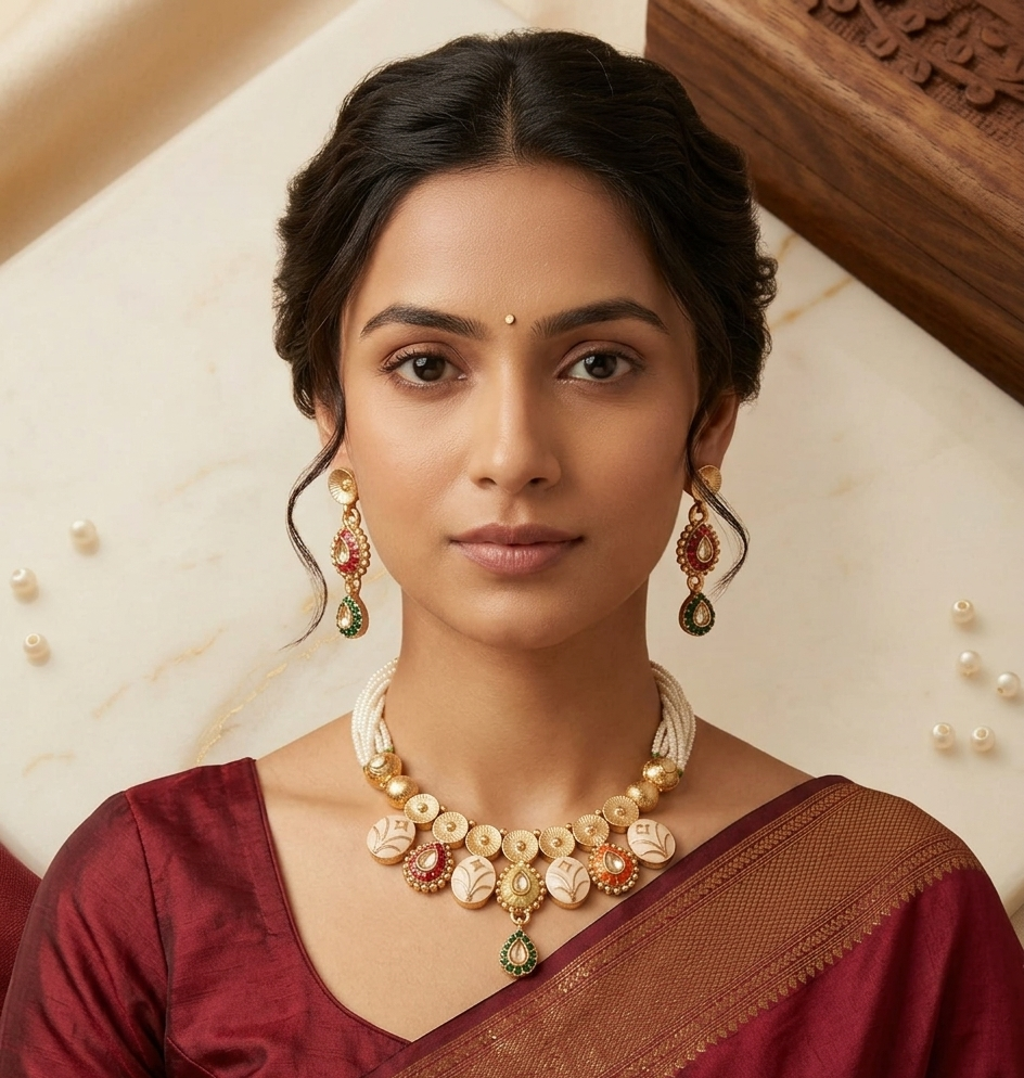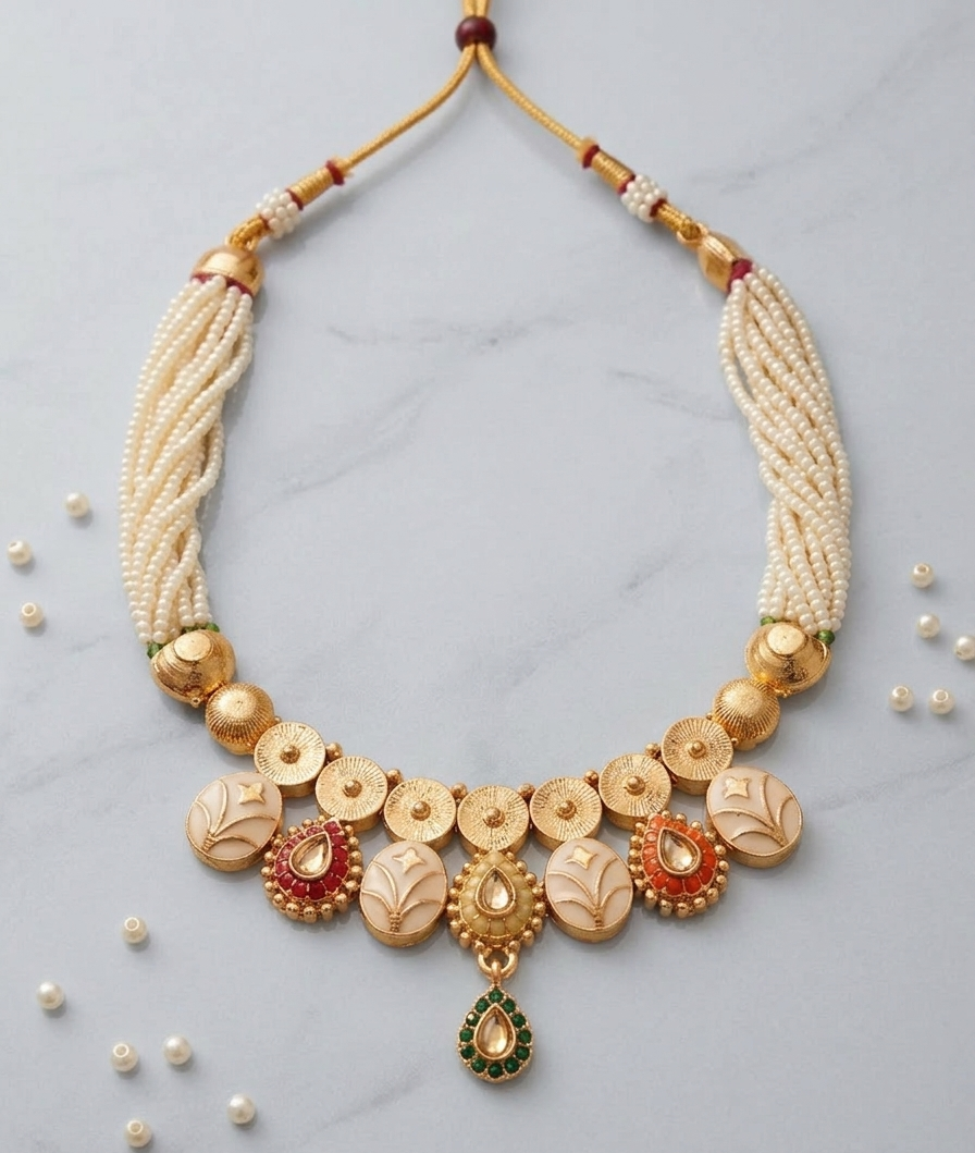 Adorn yourself with the intricate elegance of this stunning multi-strand pearl choker set, inspired by traditional Indian artistry. Perfect for a completed bridal, festive, or special occasion look, this set features a rich blend of handcrafted details.