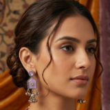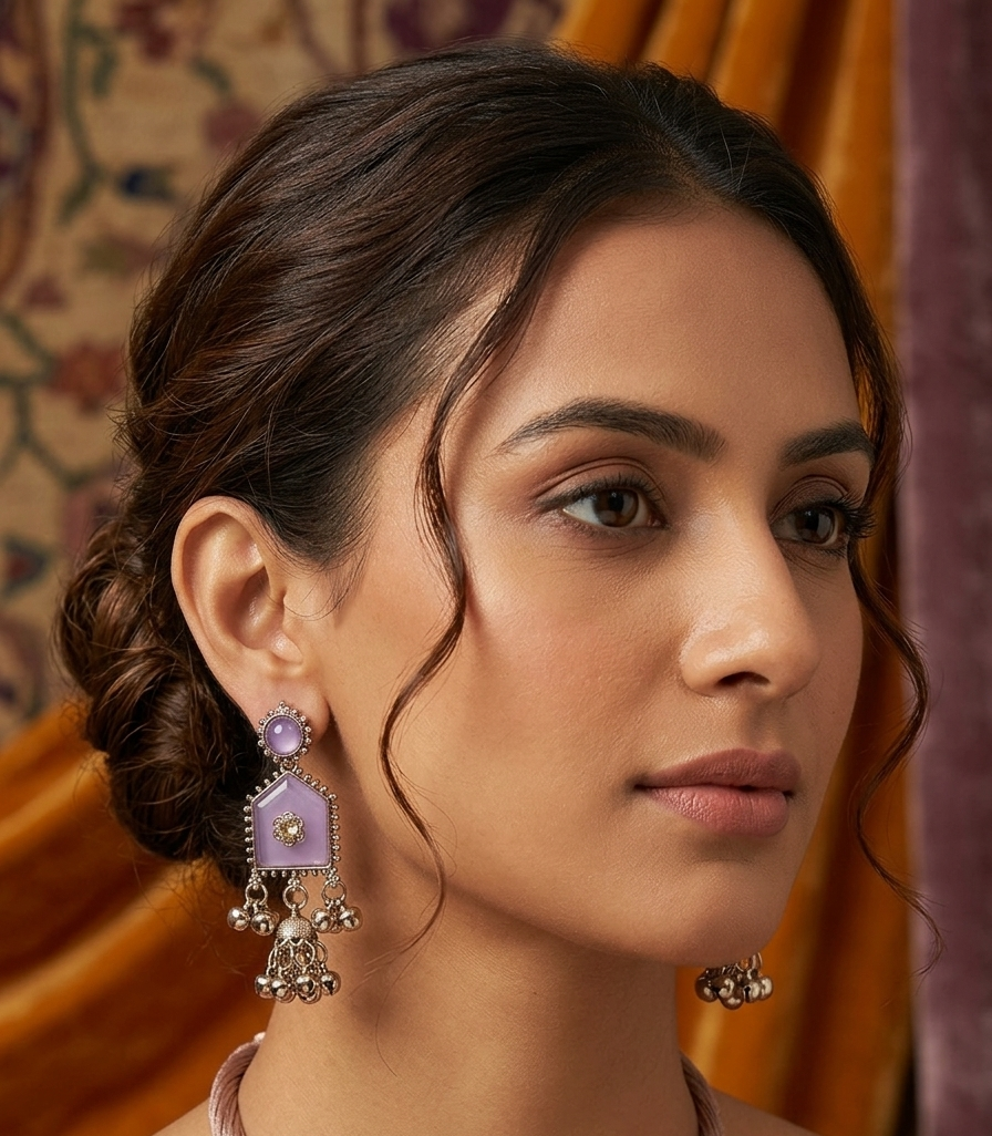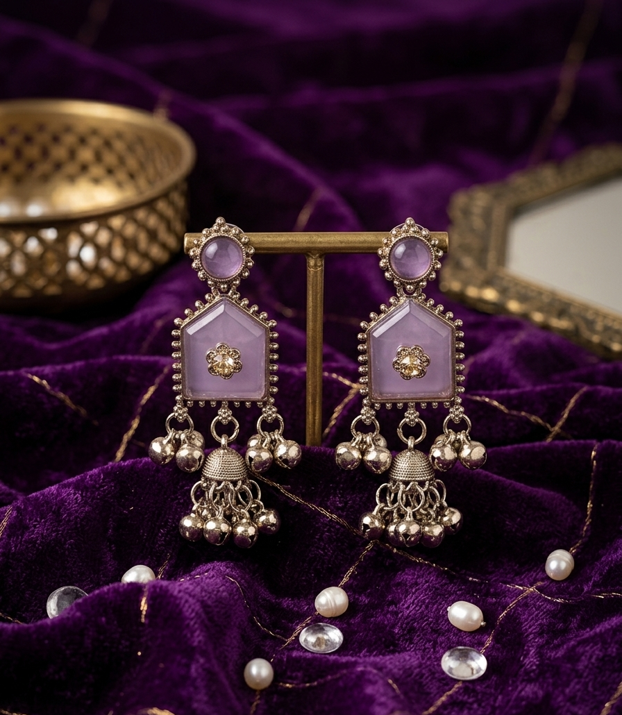 Add a touch of bohemian elegance to your look with these charming lavender jhumka earrings. Featuring multifaceted lavender stones, delicate floral accents, and playful ghungroos (dancing bells), these earrings are perfect for festivals, special occasions, or simply adding a unique flourish to your everyday style. Crafted with care and attention to detail, they are a beautiful statement piece that reflects individual taste.