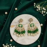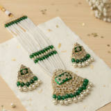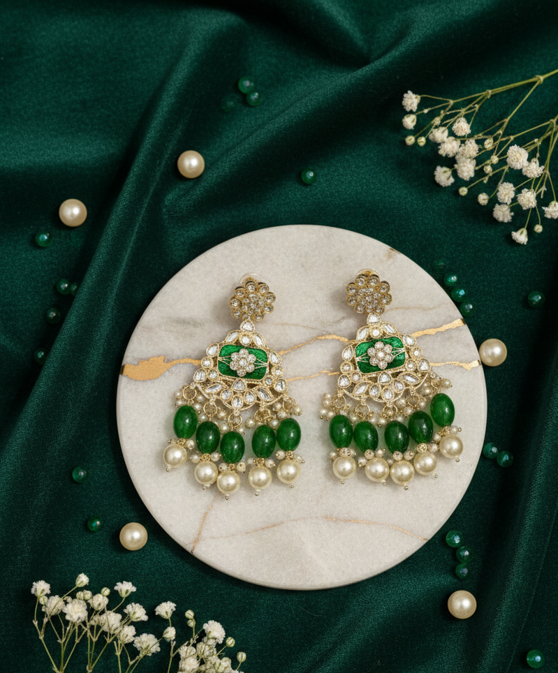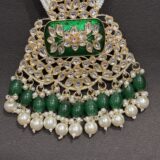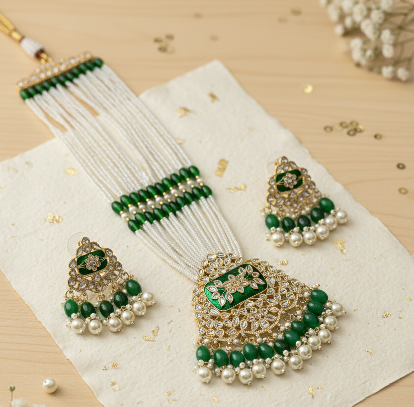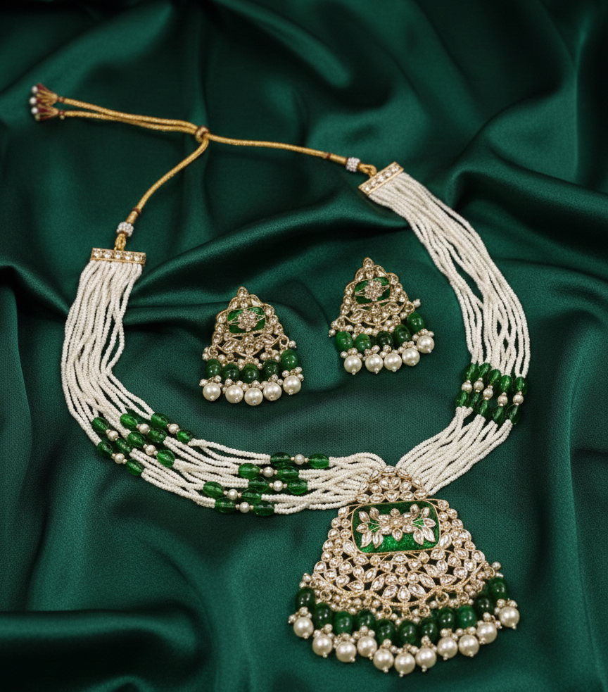 • Artisanal Meenakari Work: The central pendant and earrings feature hand-painted green enamel work, adding a pop of rich, festive color.