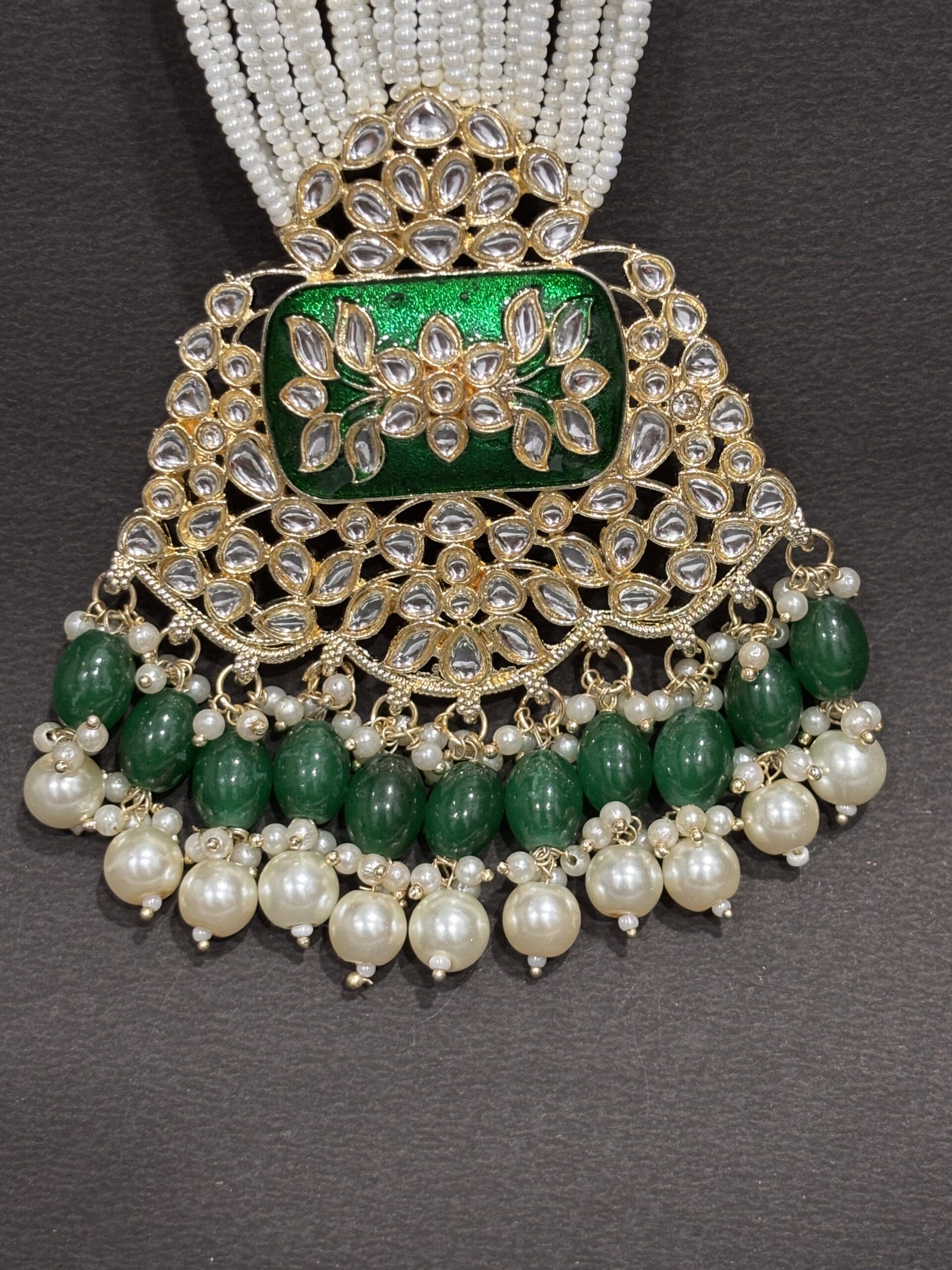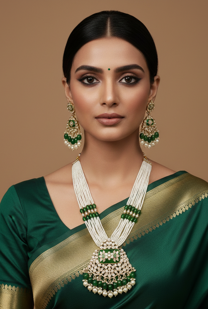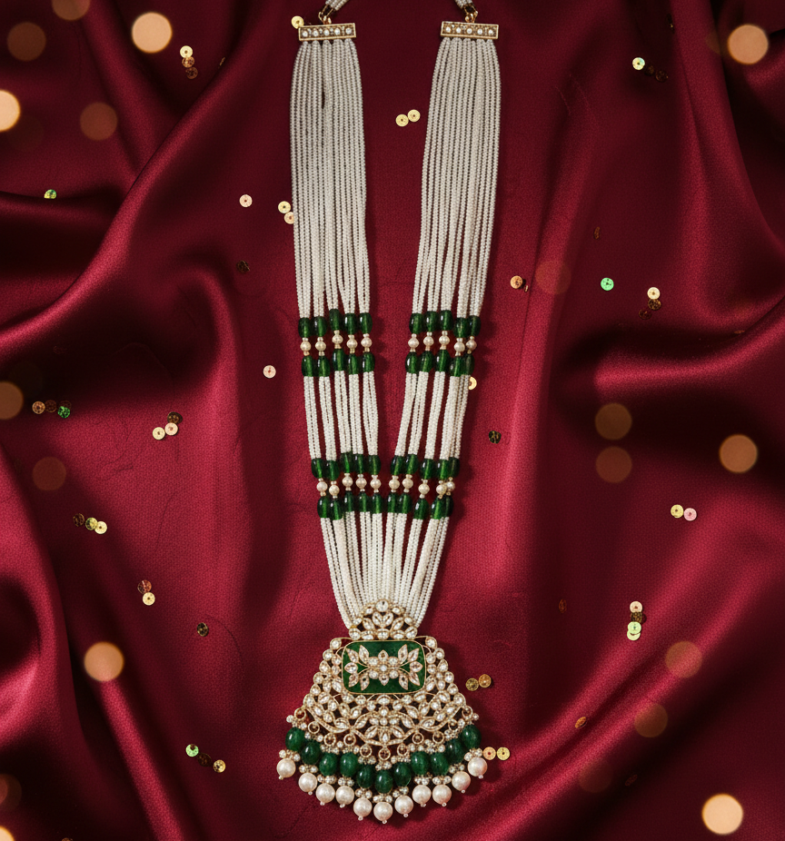 Step into the spotlight with our Imperial Rani Haar, a masterpiece of traditional jewelry design. This set features a magnificent, oversized pendant characterized by intricate floral Kundan work and a vibrant emerald-green Meenakari center. Suspended from eleven luxurious strands of seed pearls and accented with matching green beads, this long-line necklace is designed for those who want to embody the grace and grandeur of royalty.