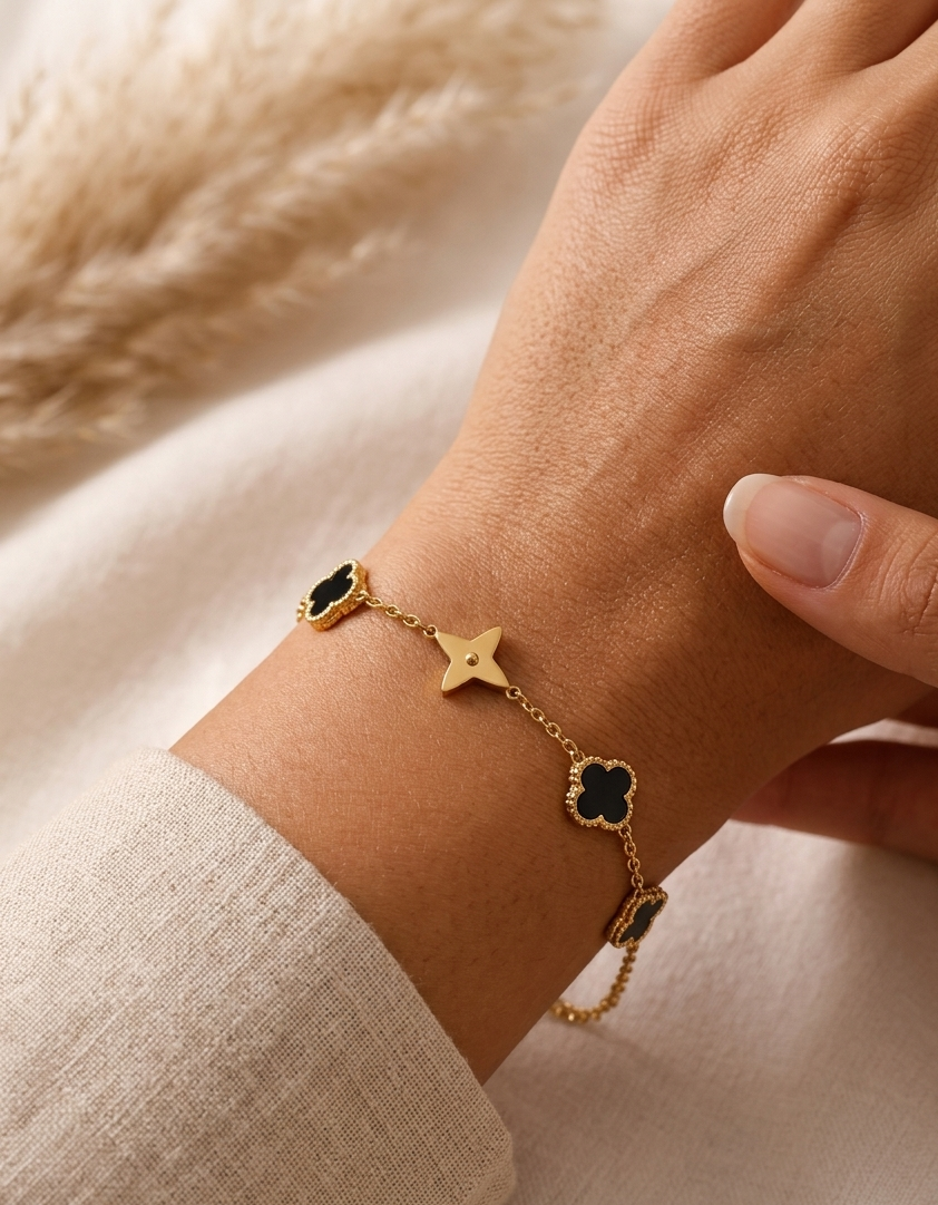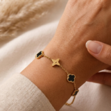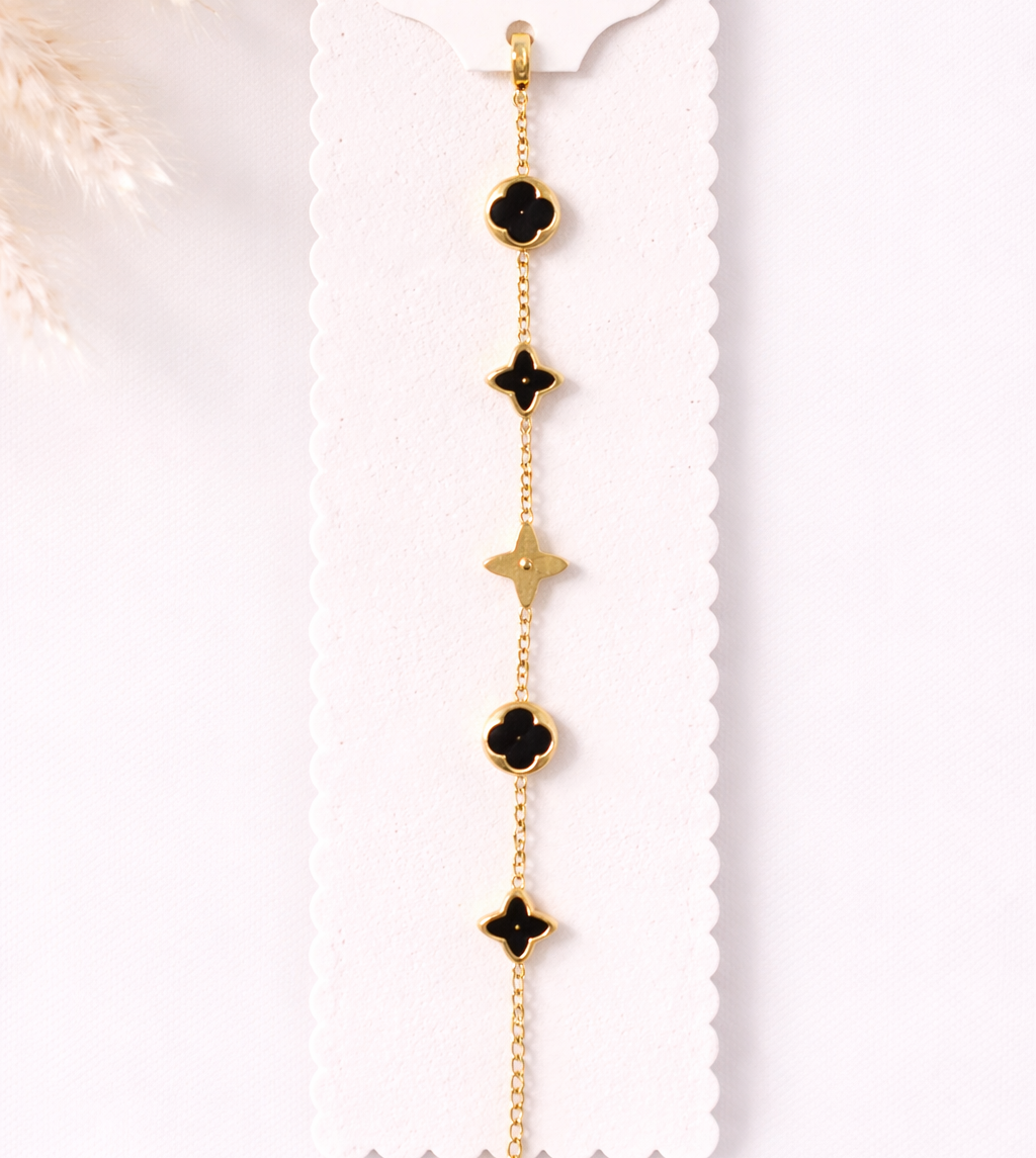 Elevate your everyday style with this elegant anti-tarnish gold bracelet, designed with a delicate chain and beautifully spaced clover-shaped charms. Featuring a mix of glossy black enamel and polished gold motifs, this bracelet offers a perfect balance of modern luxury and timeless sophistication.