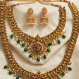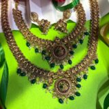 Be the first to review “Matte Gold Antique Temple Necklace Set with Green Beads & Jhumkas”