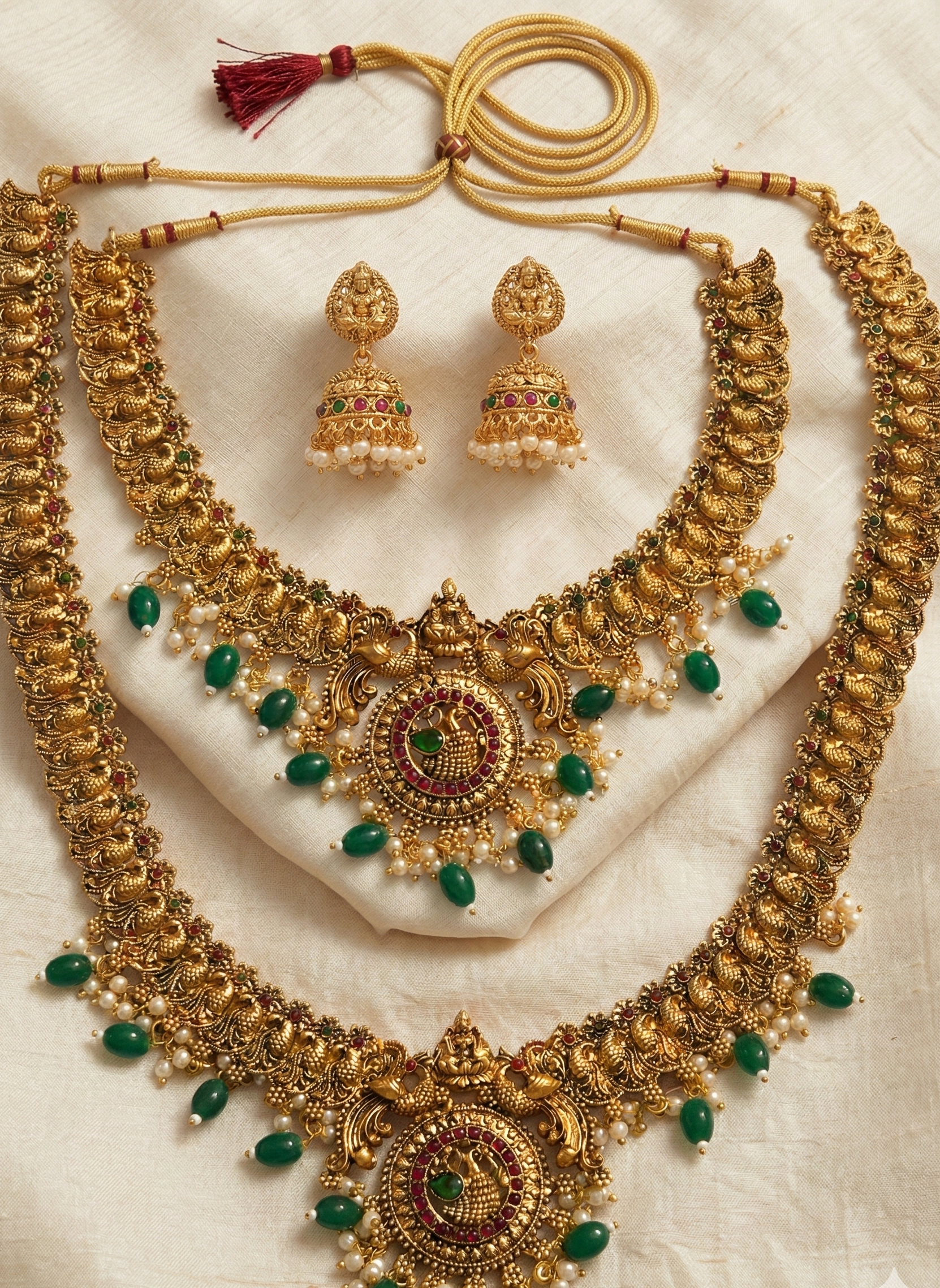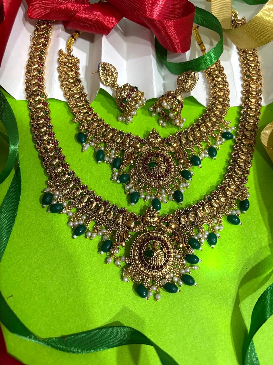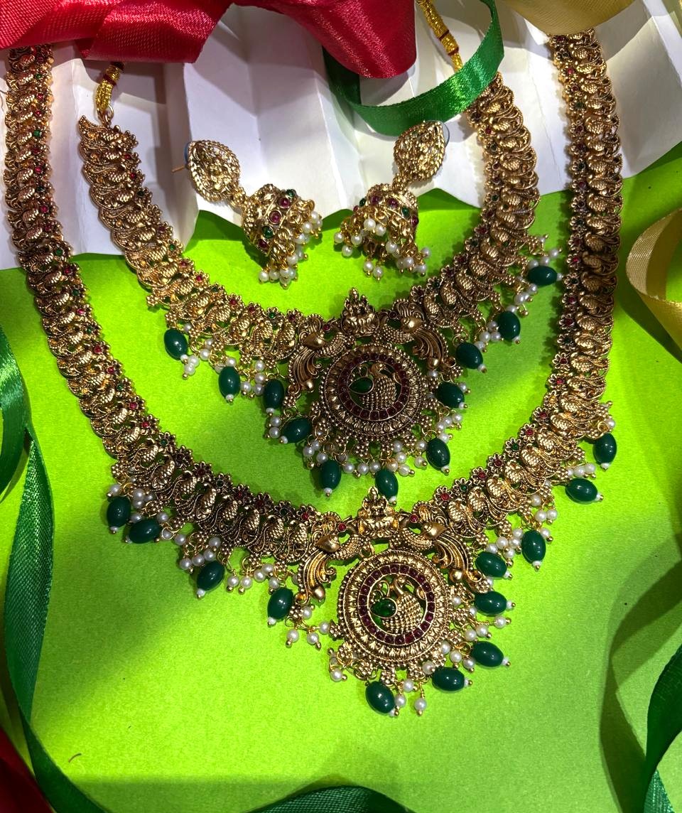 Upgrade your ethnic wardrobe with this 3-piece antique gold-plated jewelry set. Inspired by traditional temple designs, this set includes a choker-style necklace and a long necklace, both featuring detailed peacock metalwork and green bead drops.