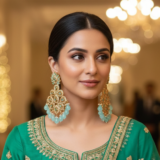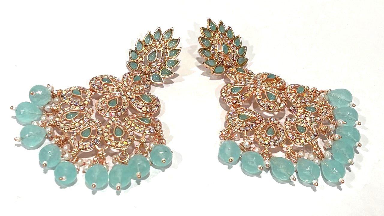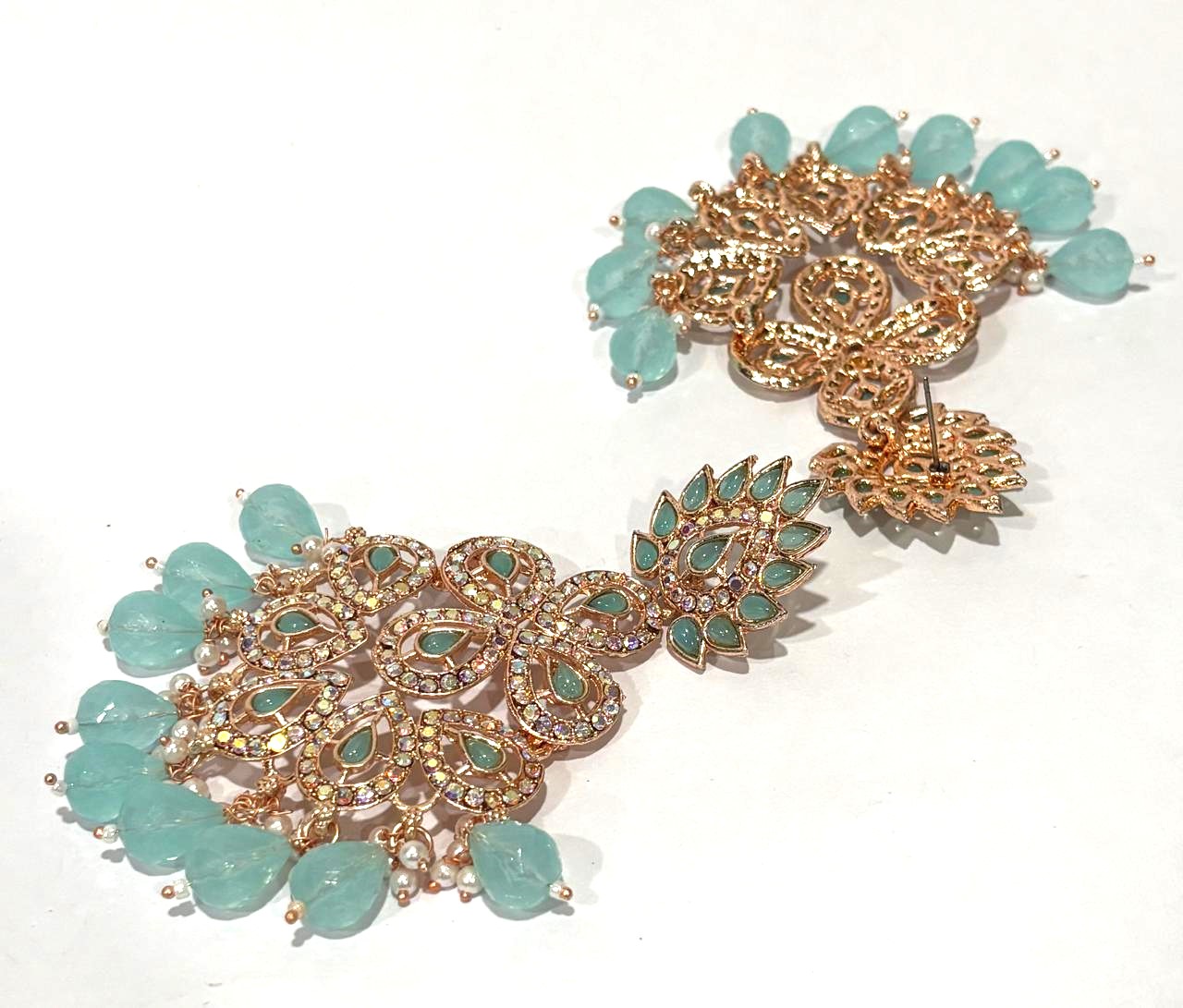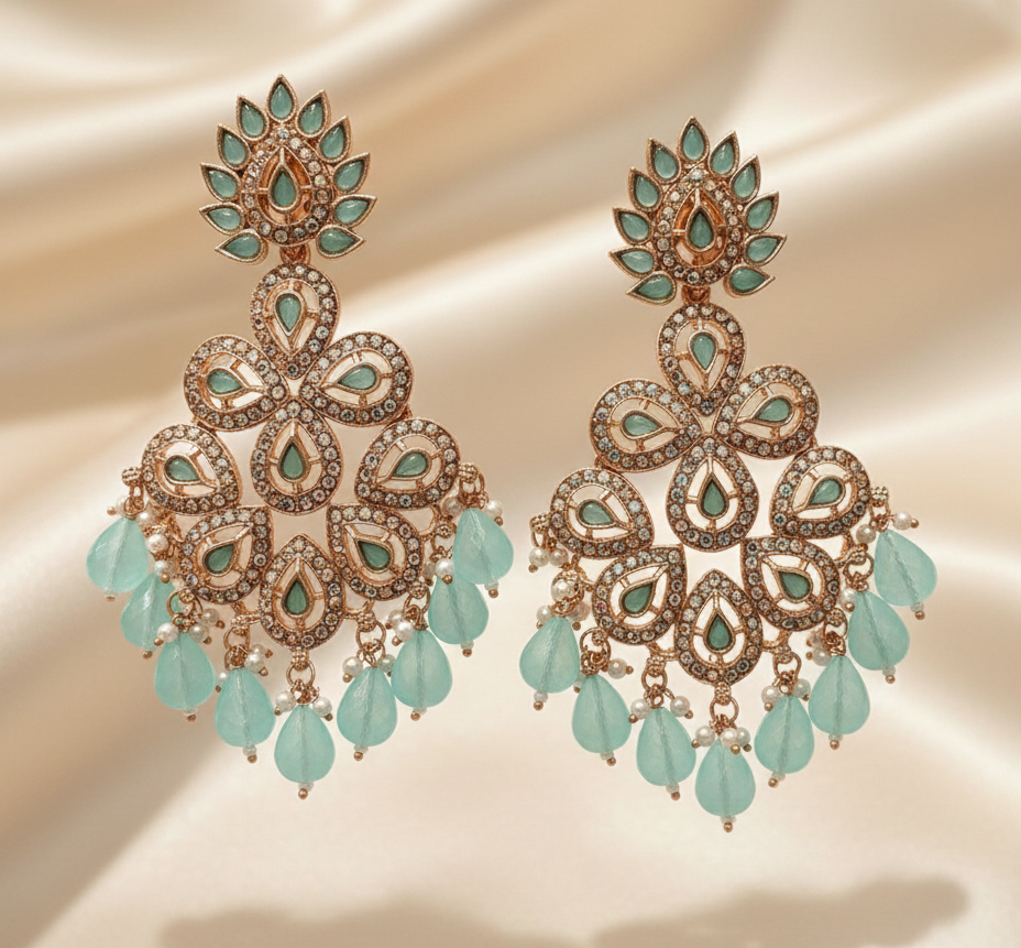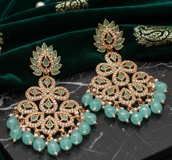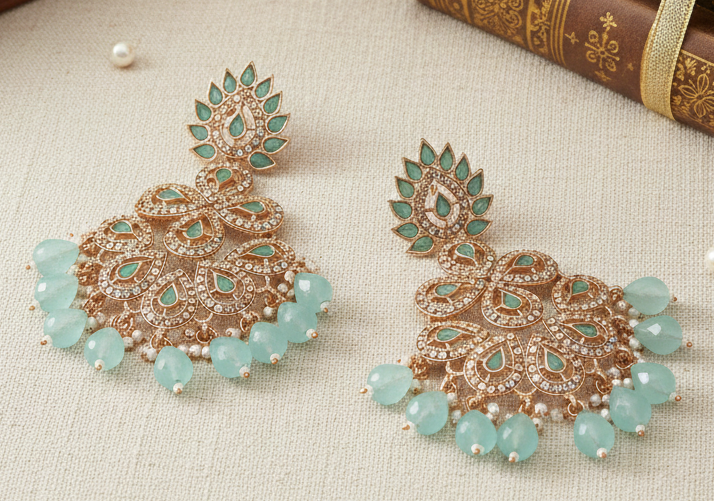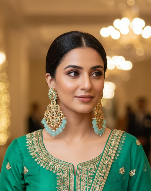 The bold crescent silhouette is enhanced with sparkling stone detailing and finished with cascading aqua bead drops and tiny pearl accents that add graceful movement and richness. Perfect for weddings, festive occasions, receptions, and special celebrations, these earrings beautifully complement both traditional and Indo-western outfits.