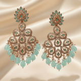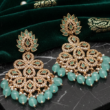 Make a grand style statement with these Aqua Teardrop Floral Statement Chandbali Earrings, crafted to exude royal elegance and festive charm. Designed in a luxurious gold-tone finish, these earrings feature intricate floral motifs adorned with shimmering crystal embellishments and delicate aqua teardrop stones arranged in a symmetrical pattern.