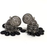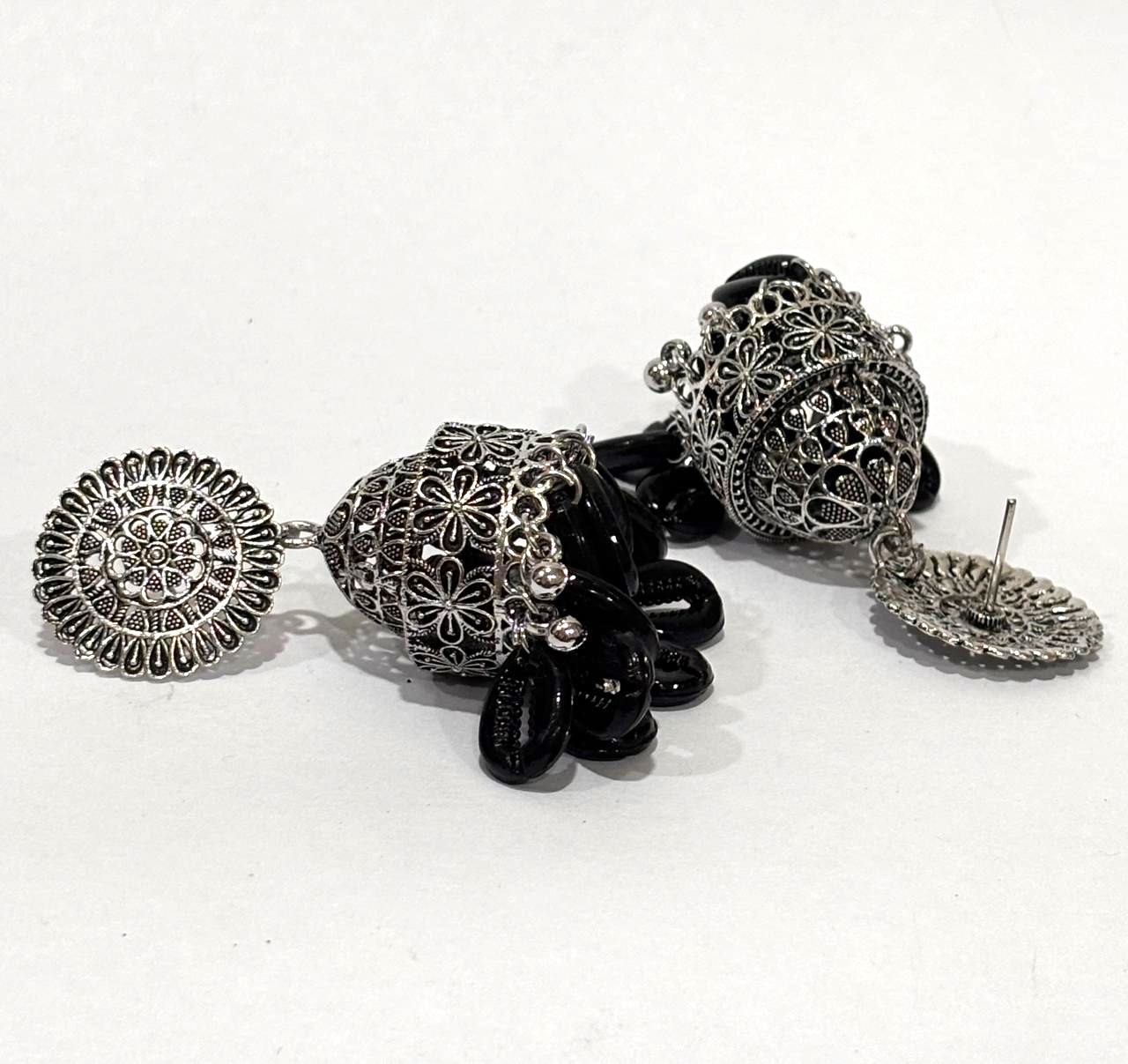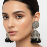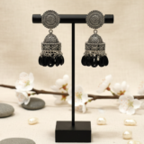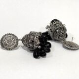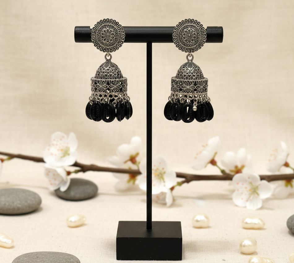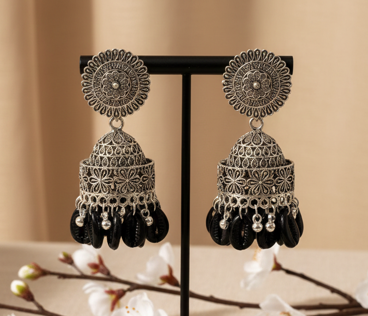 Be the first to review “Oxidized Silver Floral Jhumkas with Black Shell Accents”