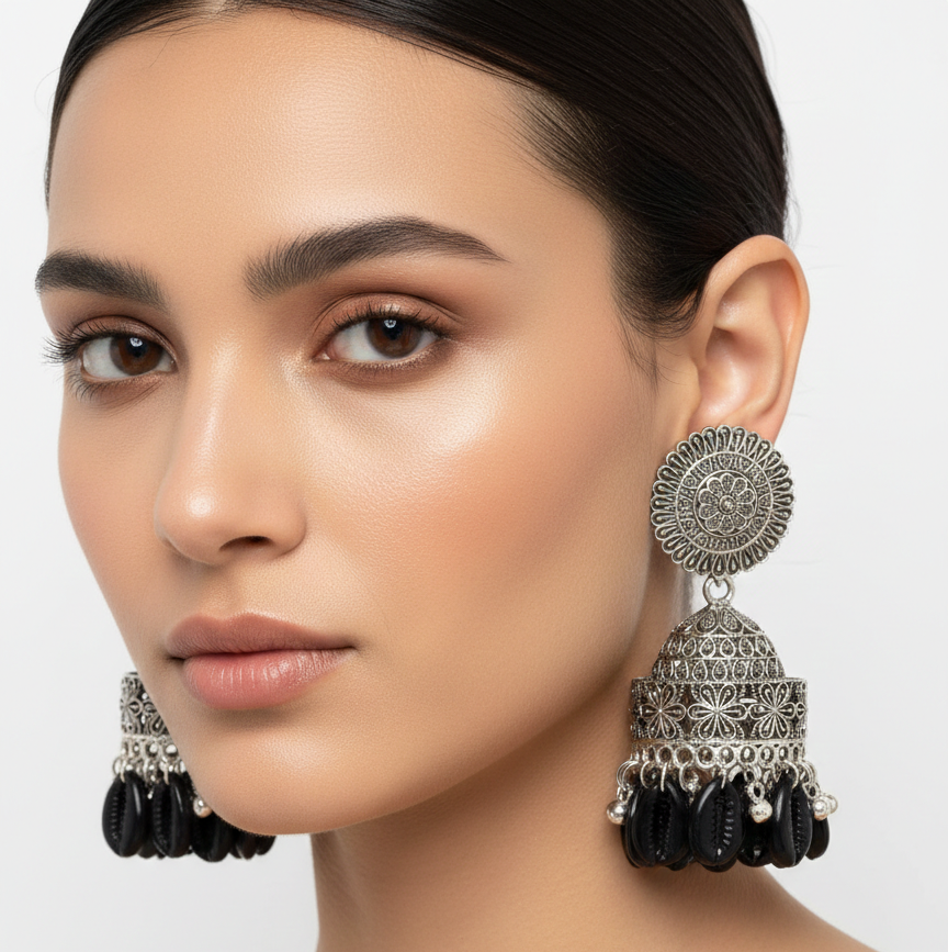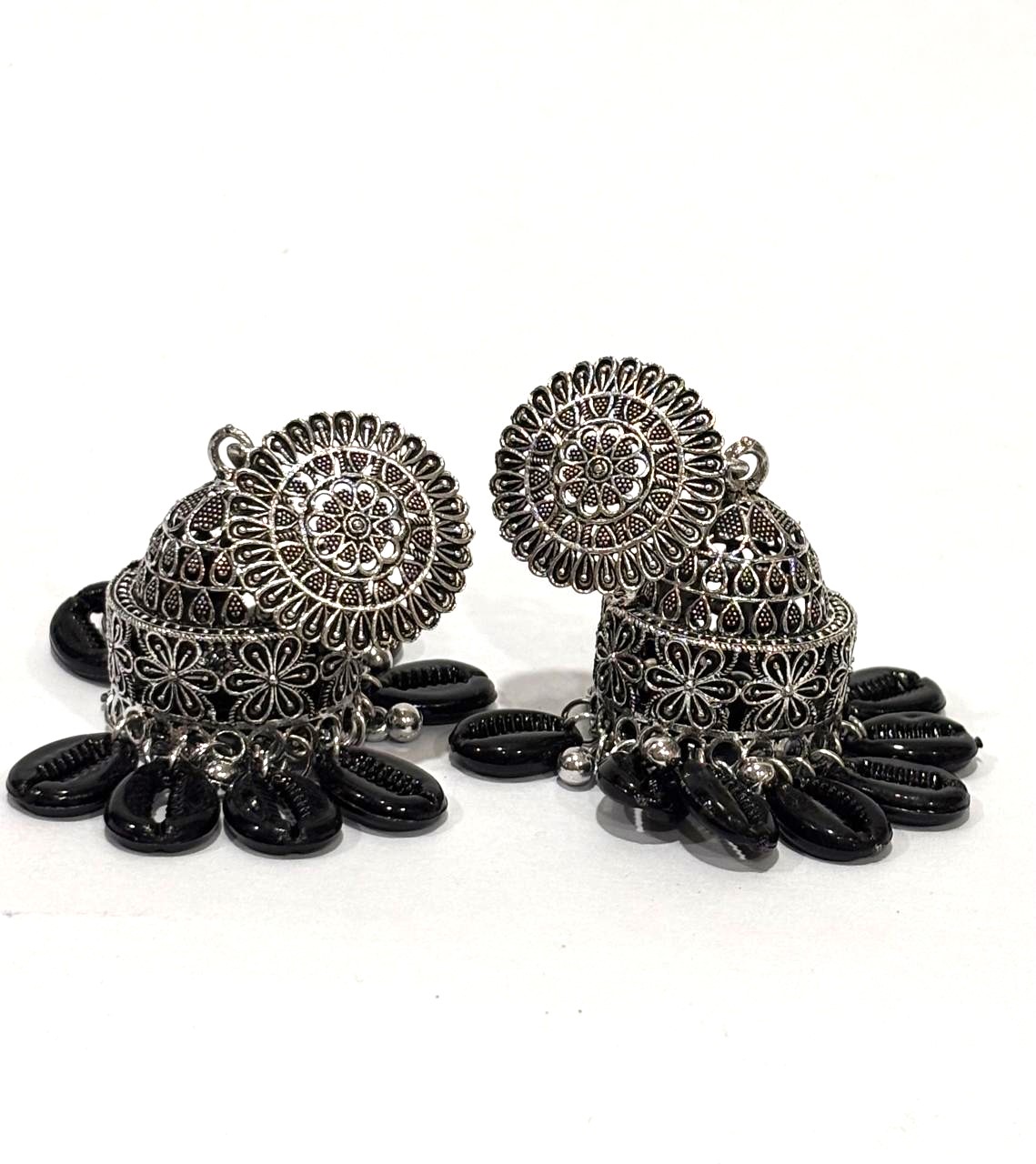 Add a touch of vintage ethnic charm to your look with these stunning oxidized silver jhumka earrings. The design features a beautifully detailed circular stud with a traditional sunburst pattern, leading down to a classic bell-shaped jhumka. The jhumka itself is intricately embossed with delicate floral motifs and finished with a unique fringe of polished black cowrie-style shells and silver metallic beads.