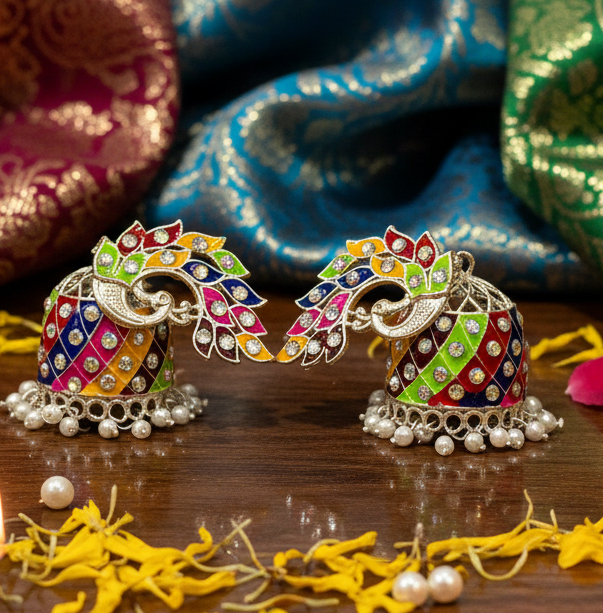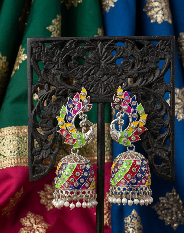 Embrace a vibrant celebration of color with these exquisite silver-toned peacock jhumka earrings. The design features a gracefully curved peacock stud, with its majestic tail feathers rendered in a stunning rainbow enamel palette of lime green, sunny yellow, bright orange, ruby red, deep purple, and sapphire blue. Each feather is further accented with a sparkling clear crystal for added brilliance.