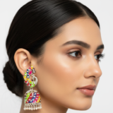 The traditional bell-shaped jhumka drop continues the festive theme with a multicolored geometric pattern, encrusted with shimmering crystals. The look is completed with a delicate fringe of white seed pearls, adding a touch of classic elegance to this bold, bohemian piece.