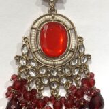 The central gem is encased in a sophisticated double-halo frame of delicate seed pearls and shimmering clear crystals. Intricate filigree floral accents branch out from the sides, leading to a dramatic, tiered fringe of deep crimson faceted beads. These teardrop-shaped beads provide a rich, multi-tonal effect and elegant movement, making them an ideal choice for regal celebrations.