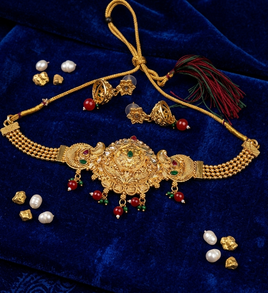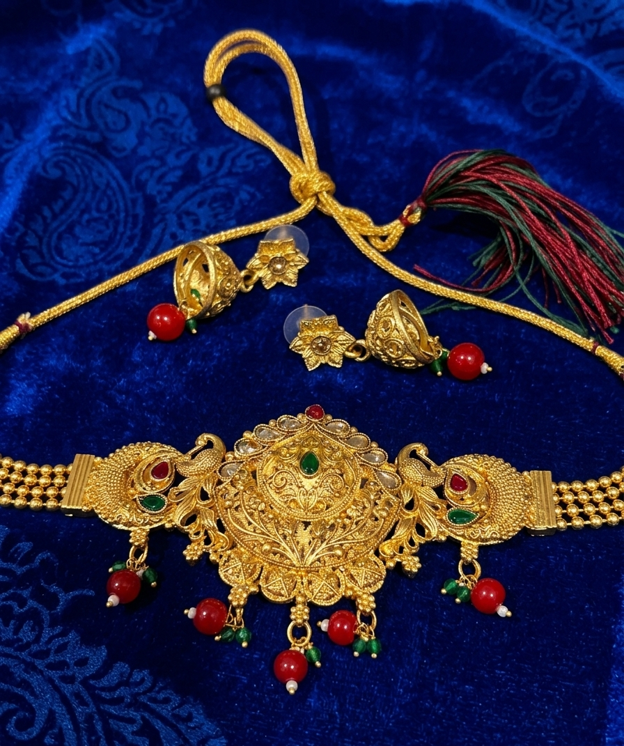 Unlock timeless elegance with this flawless traditional gold-plated choker and matching earring set. At the heart is a detailed peacock filigree centerpiece, jeweled with ruby and emerald accents and clear crystal stones. It is finished with a stunning waterfall of ruby-red beads and tiny green spacers for a cascade of color. Complete with matching star-cluster stud jhumka earrings. Presented beautifully on rich blue velvet, this set includes a classically adjustable golden dori (cord) for a perfect fit. Ideal for bridal, weddings, or festive splendor.