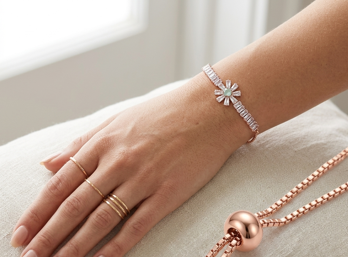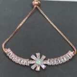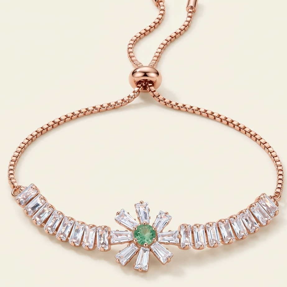 Enhance your elegance with this beautifully crafted rose gold adjustable bracelet, designed with a radiant sunburst centerpiece that captures attention effortlessly. The bracelet features sparkling baguette-cut crystals arranged in a graceful pattern, leading to a stunning central motif highlighted by a soft pastel green stone.