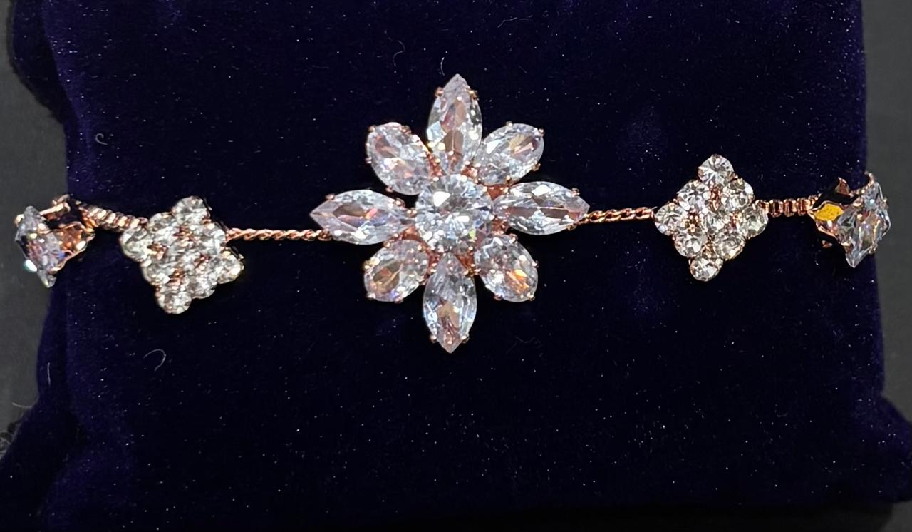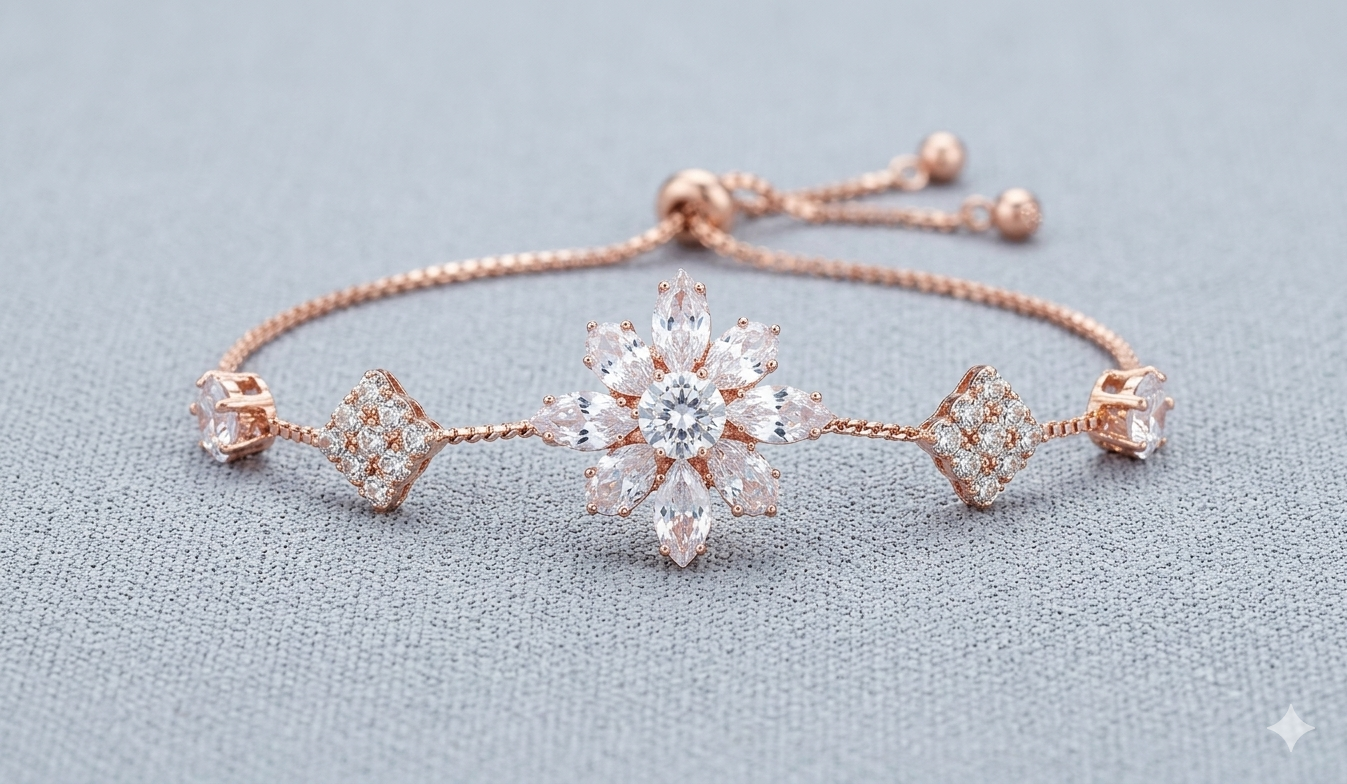 Add timeless elegance to your jewellery collection with this stunning rose gold adjustable bracelet, featuring a beautifully crafted floral centerpiece. Designed with sparkling marquise-cut and round crystals, the bracelet forms a radiant flower motif that captures light from every angle, creating a luxurious and eye-catching look.